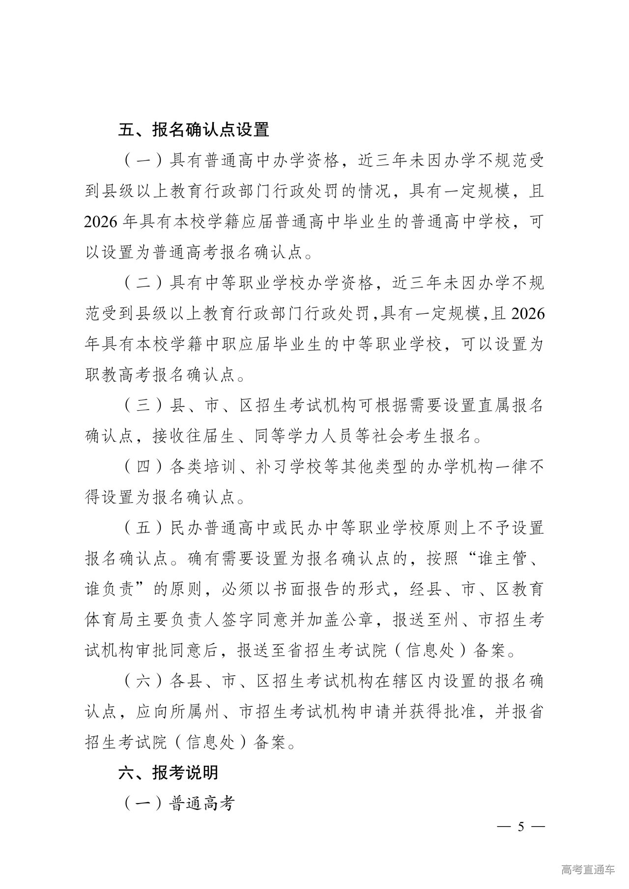 5.报名确认点选择:应届考生,选择学籍学校或县、市、区招生考试机构指定的报名确认点。本地户籍外地就读的往届考生,选择户籍所在地县、市、区招生考试机构直属点为报名确认点;本地户籍本地就读的往届考生,县、市、区招生考试机构负责考生报名资格审查,其报名确认点的选择由各县、市、区确定。