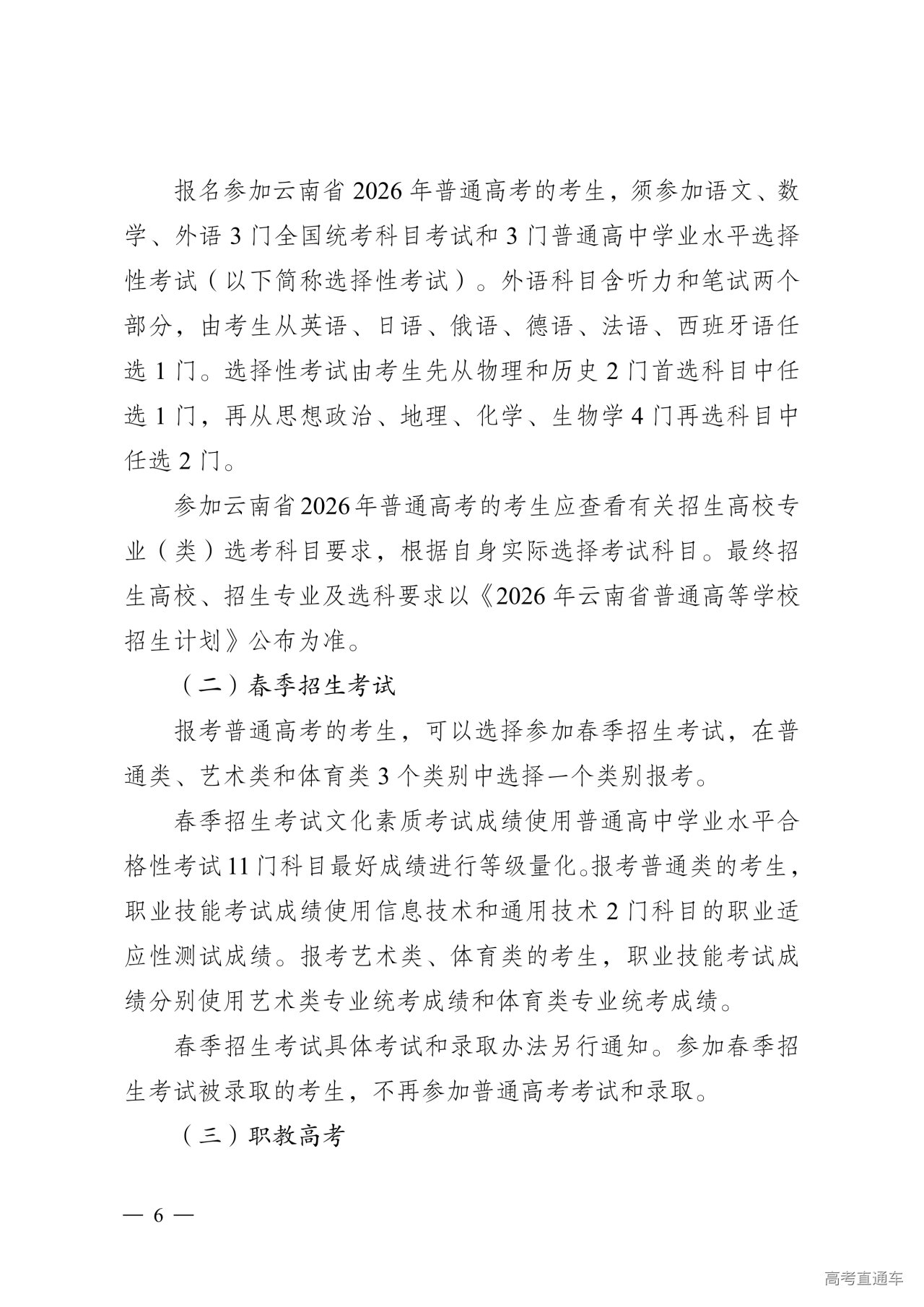 云南省2026年普通高校招生统一考试(以下简称普通高考)、云南省2026年普通高等学校面向中等职业学校毕业生考试招生(以下简称职教高考)、云南省2026年高等职业院校春季招收普通高中毕业生考试(以下简称春季招生考试)报名工作均在高考报名阶段完成。