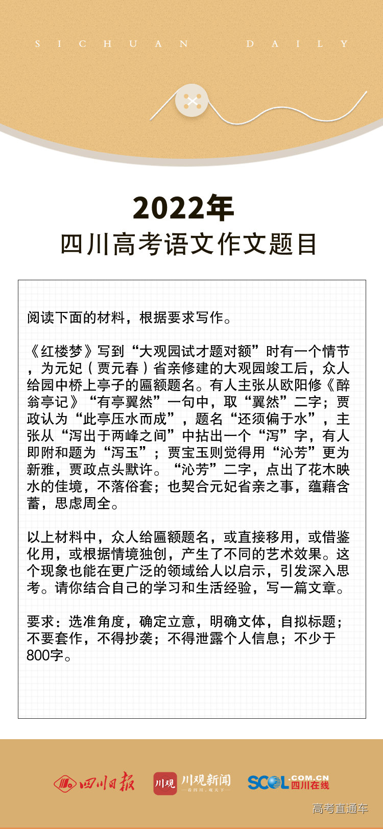 2022年四川高考语文作文题,从过去几年的新材料作文、任务驱动型作文走到了情境交际型作文的新高度,作文以《红楼梦》“大观园试才题对额”,匾额题名作为材料入手,契合了部编教材课程标准里“整本书阅读与研讨”“传统文化经典研习”“文学阅读与写作”“思辨性阅读与表达”几个学习任务群。