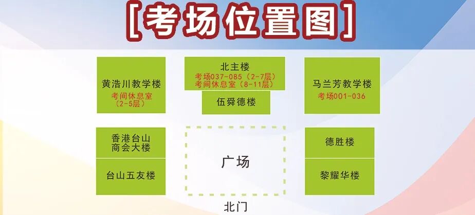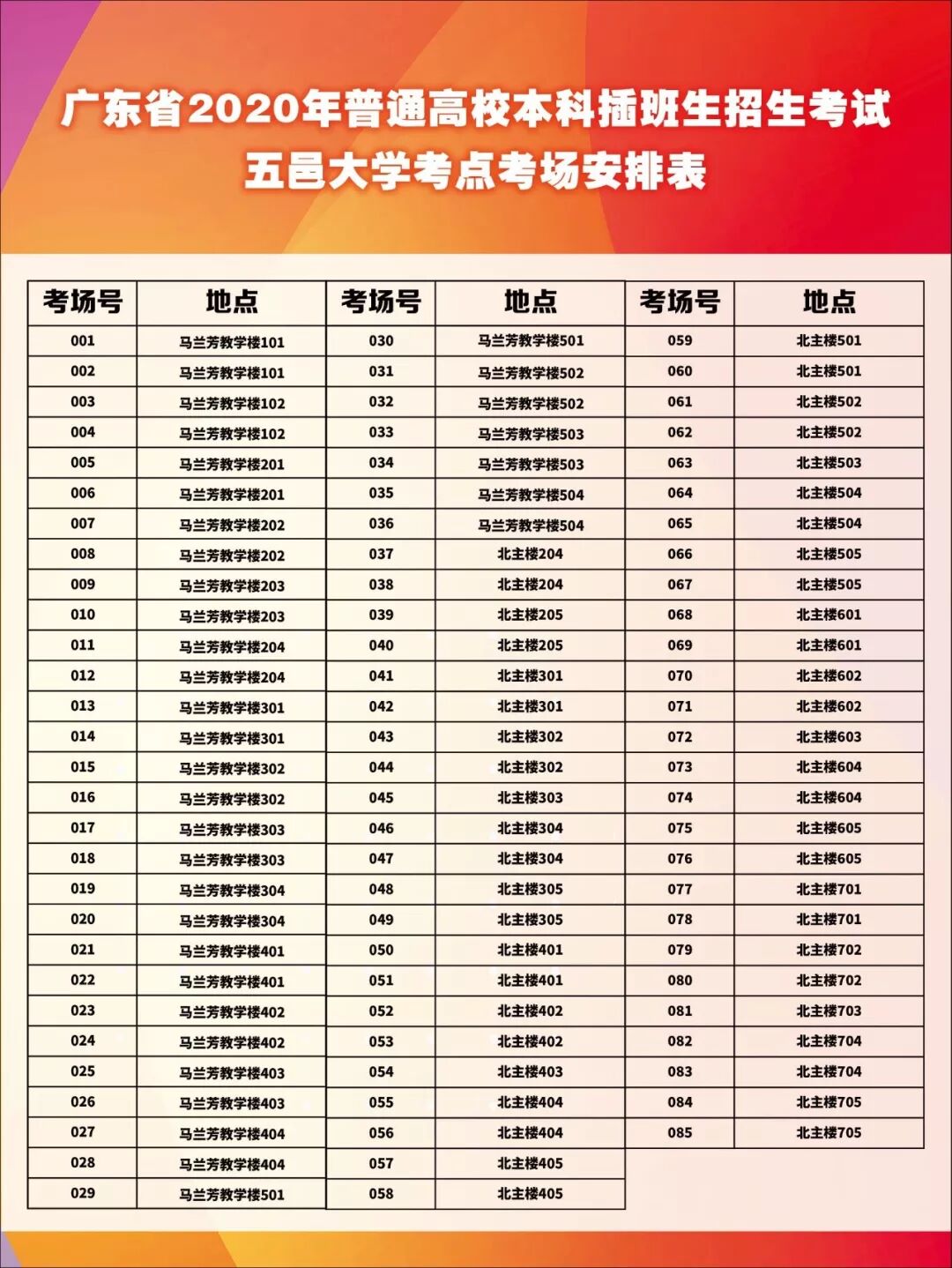 五邑大学考点本科插班生考场分布在马兰芳教学楼及北主楼。其中001-036考场安排在马兰芳教学楼,037-085考场安排在北主楼。请各考生务必提前熟知所在考场地点。