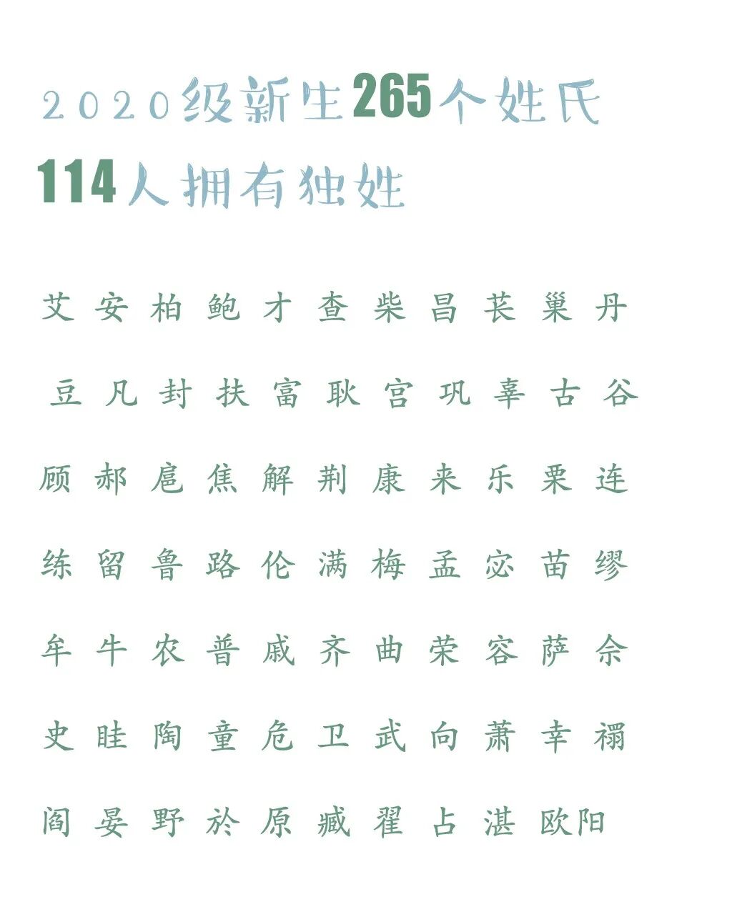 2020级新生265个姓氏,114位同学拥有独姓。