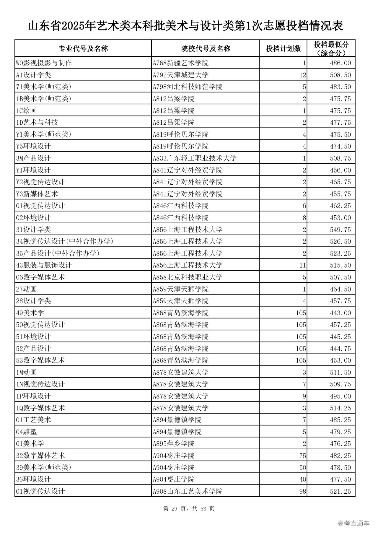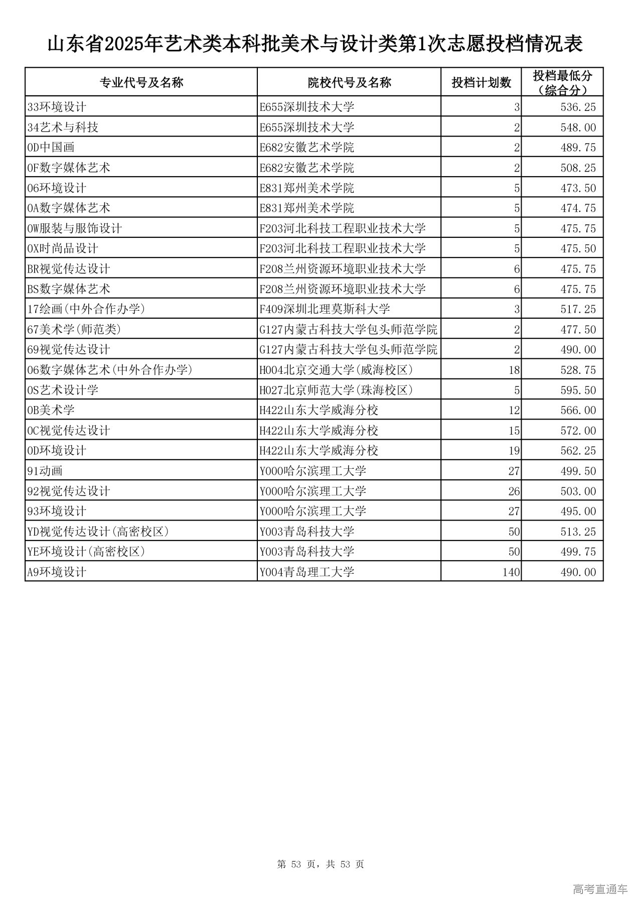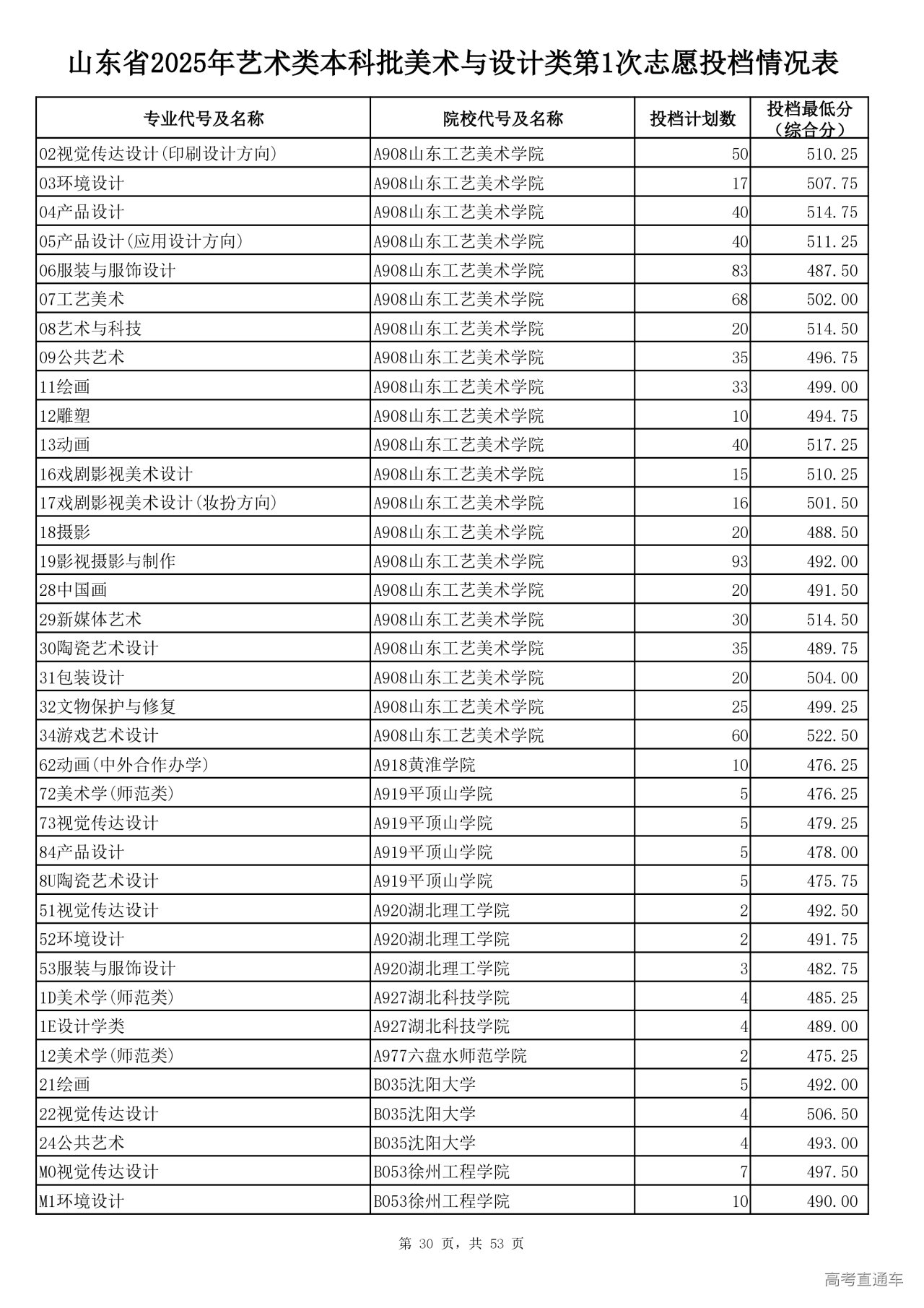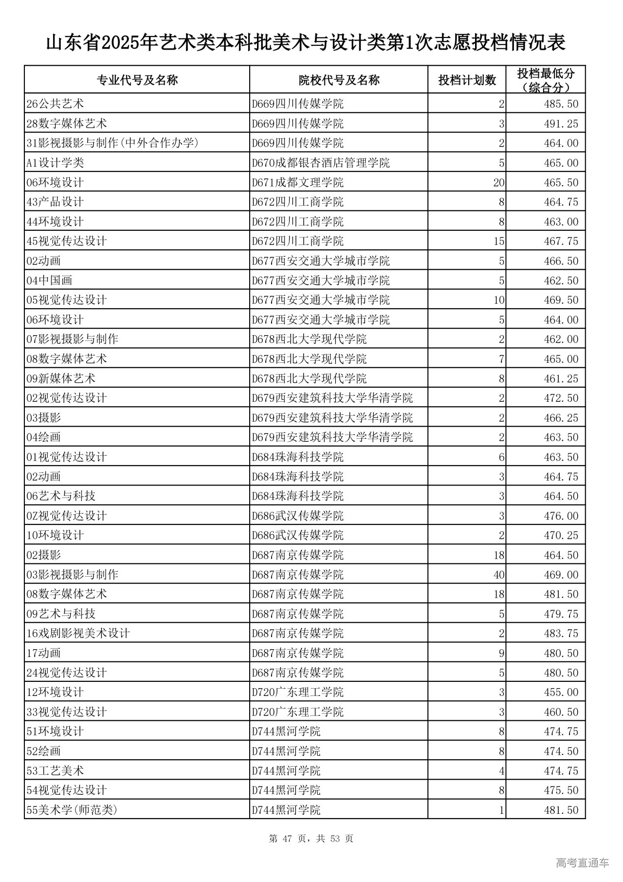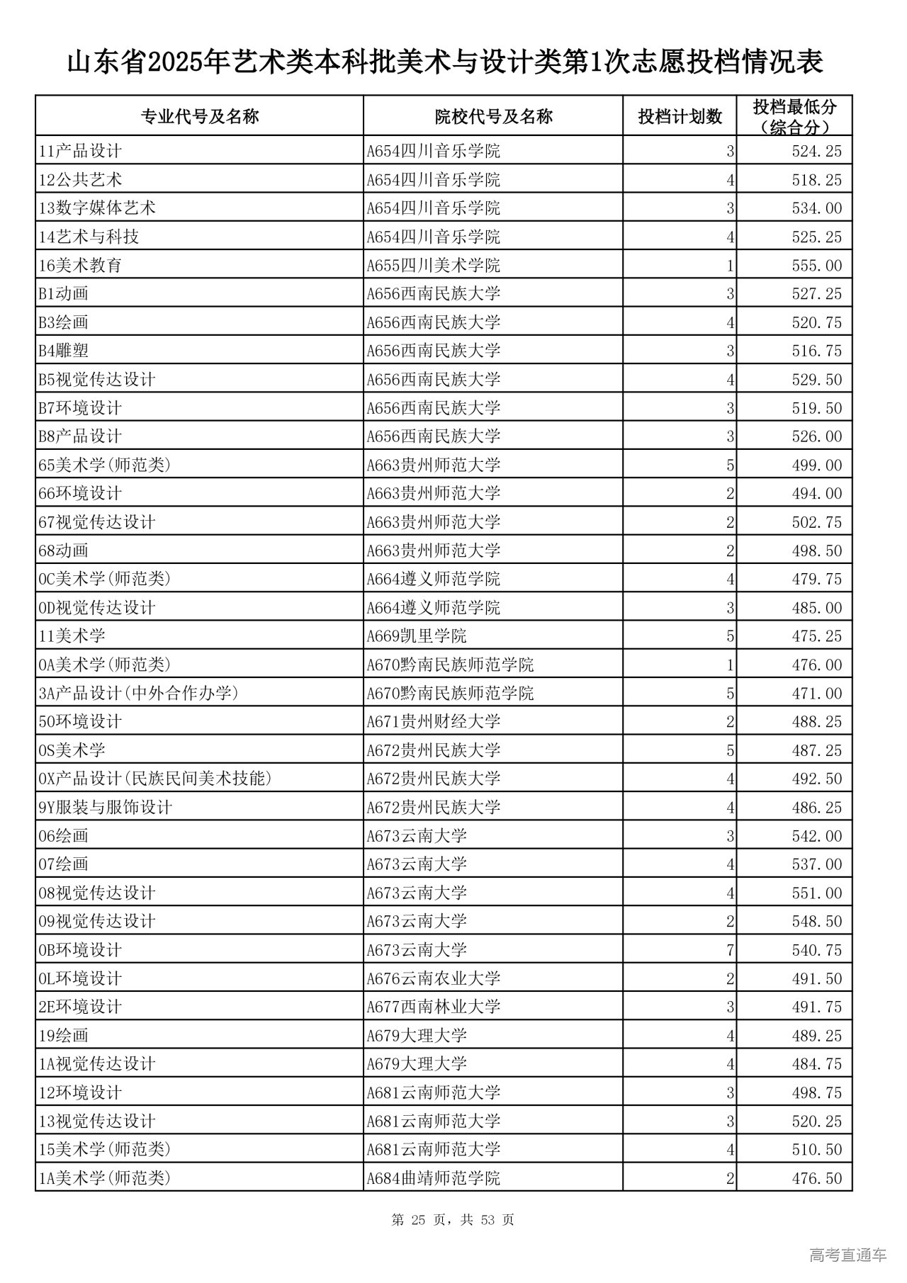 山东省2025年艺术类本科批美术与设计类第1次志愿投档情况表.xls