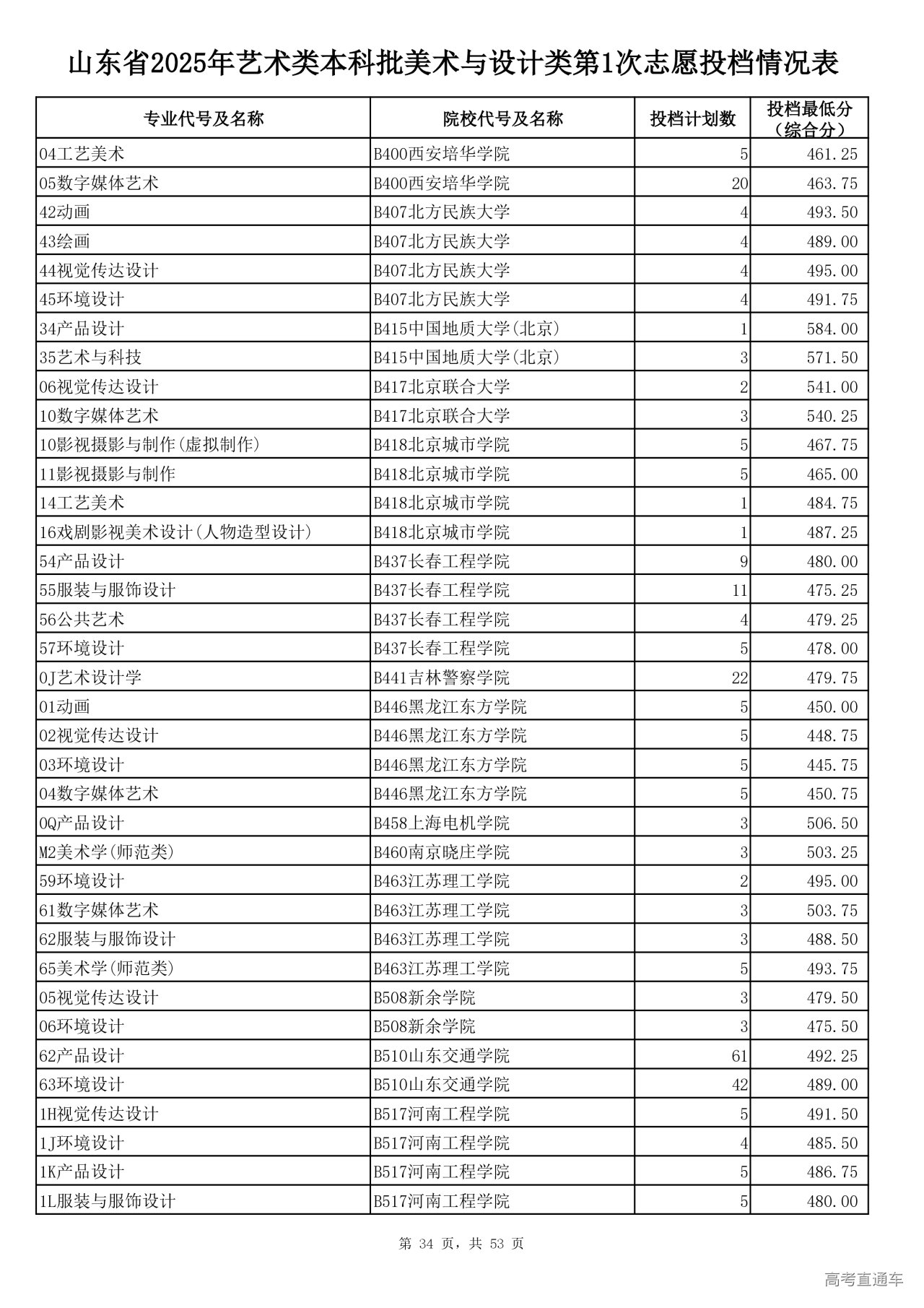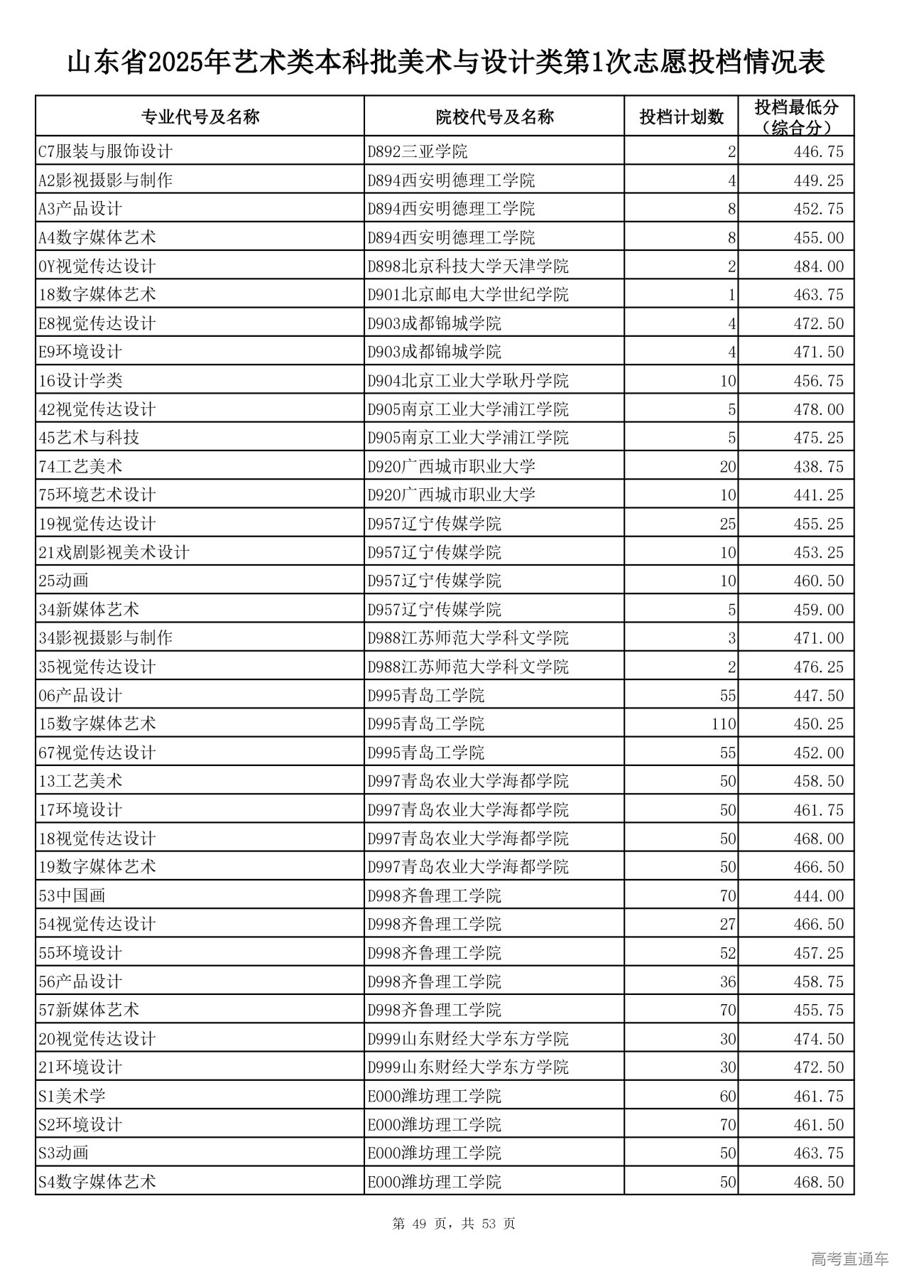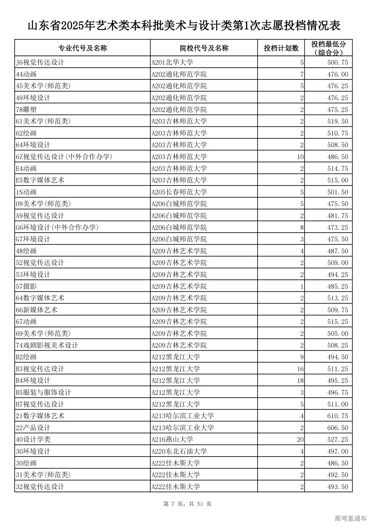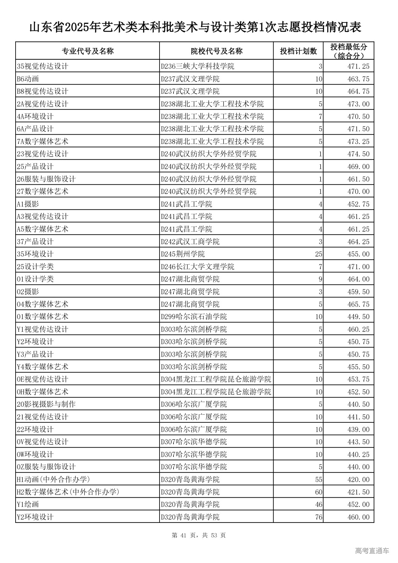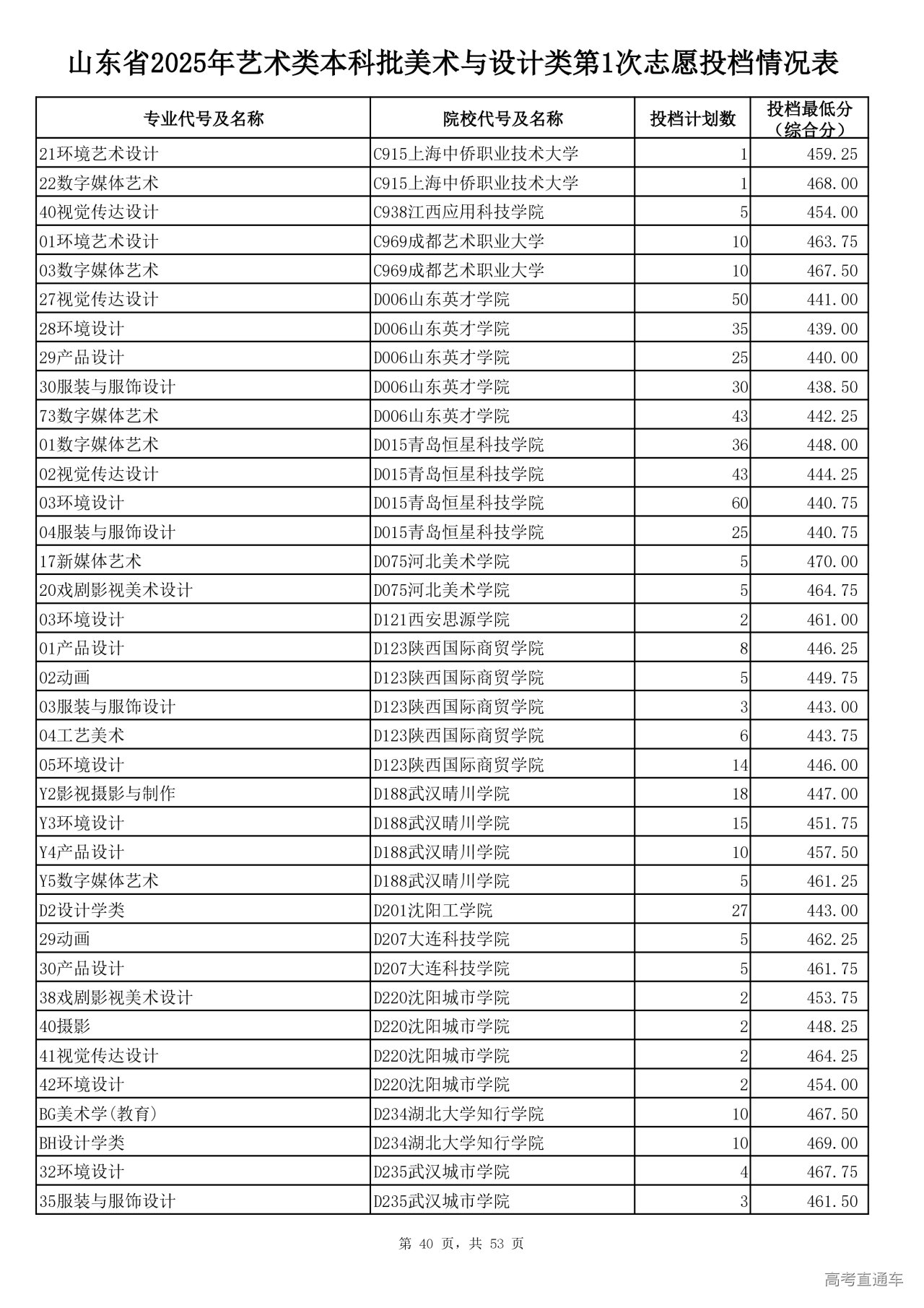 山东省2025年艺术类本科批美术与设计类第1次志愿投档情况表.xls