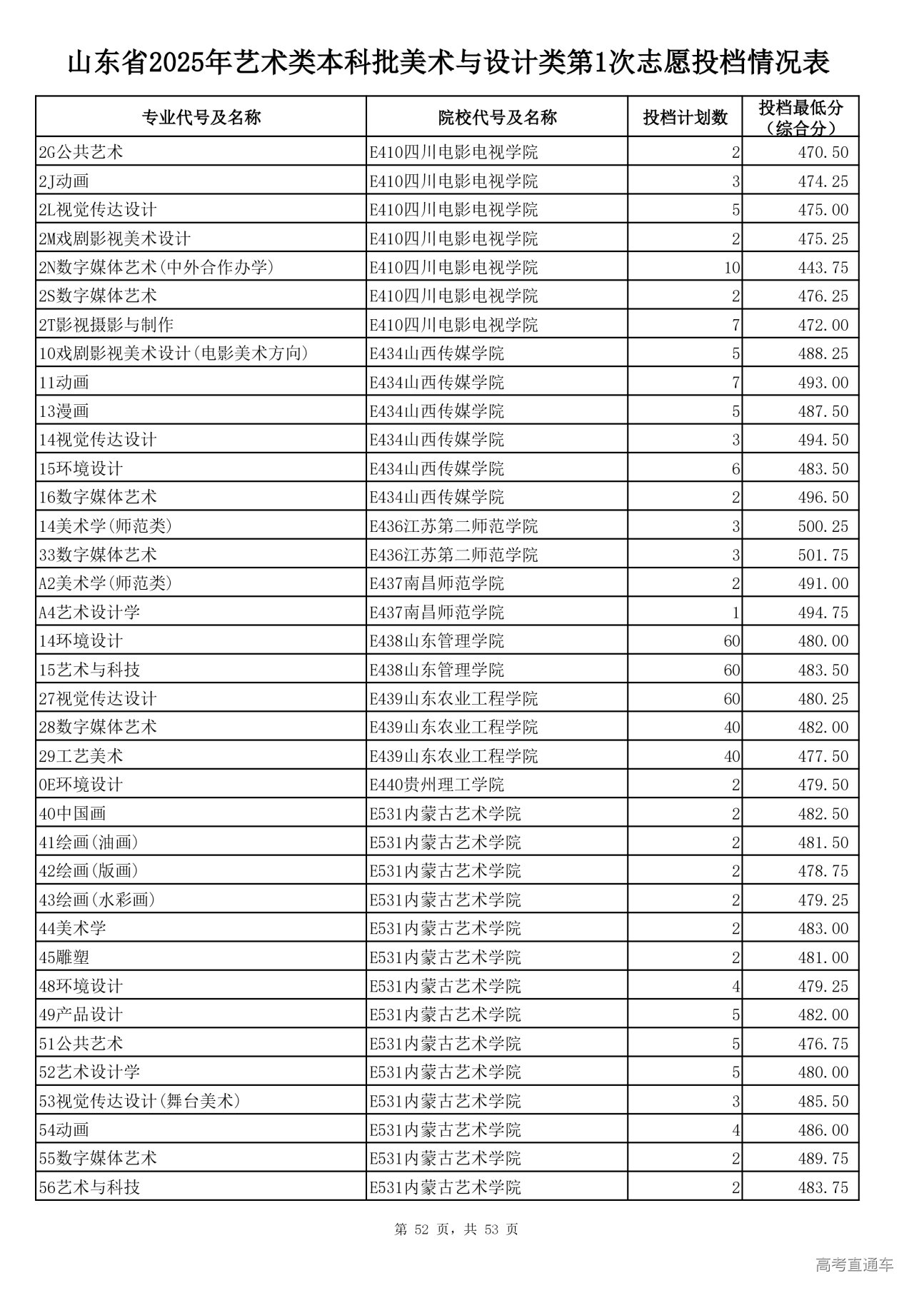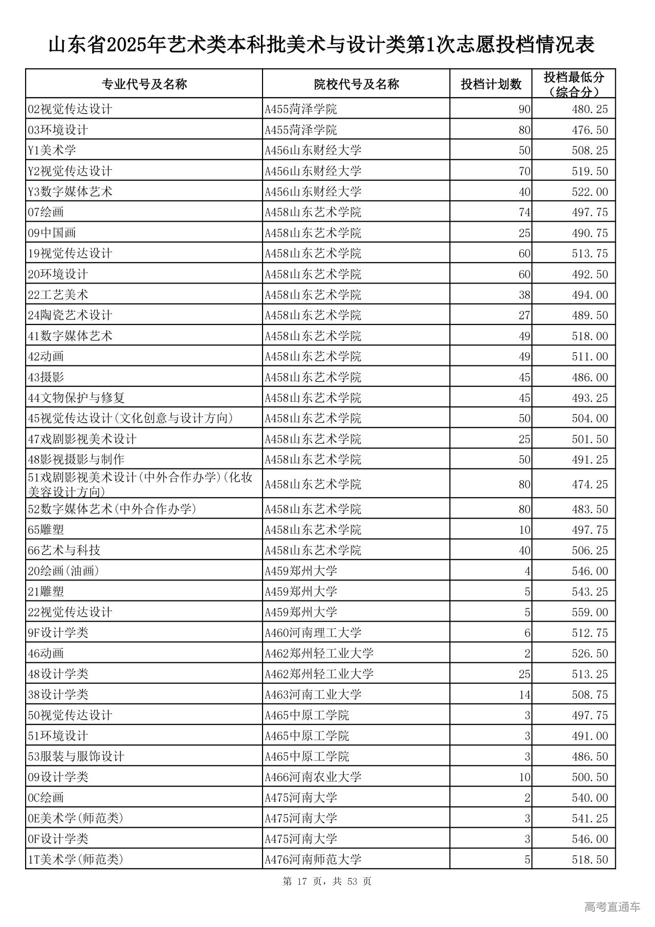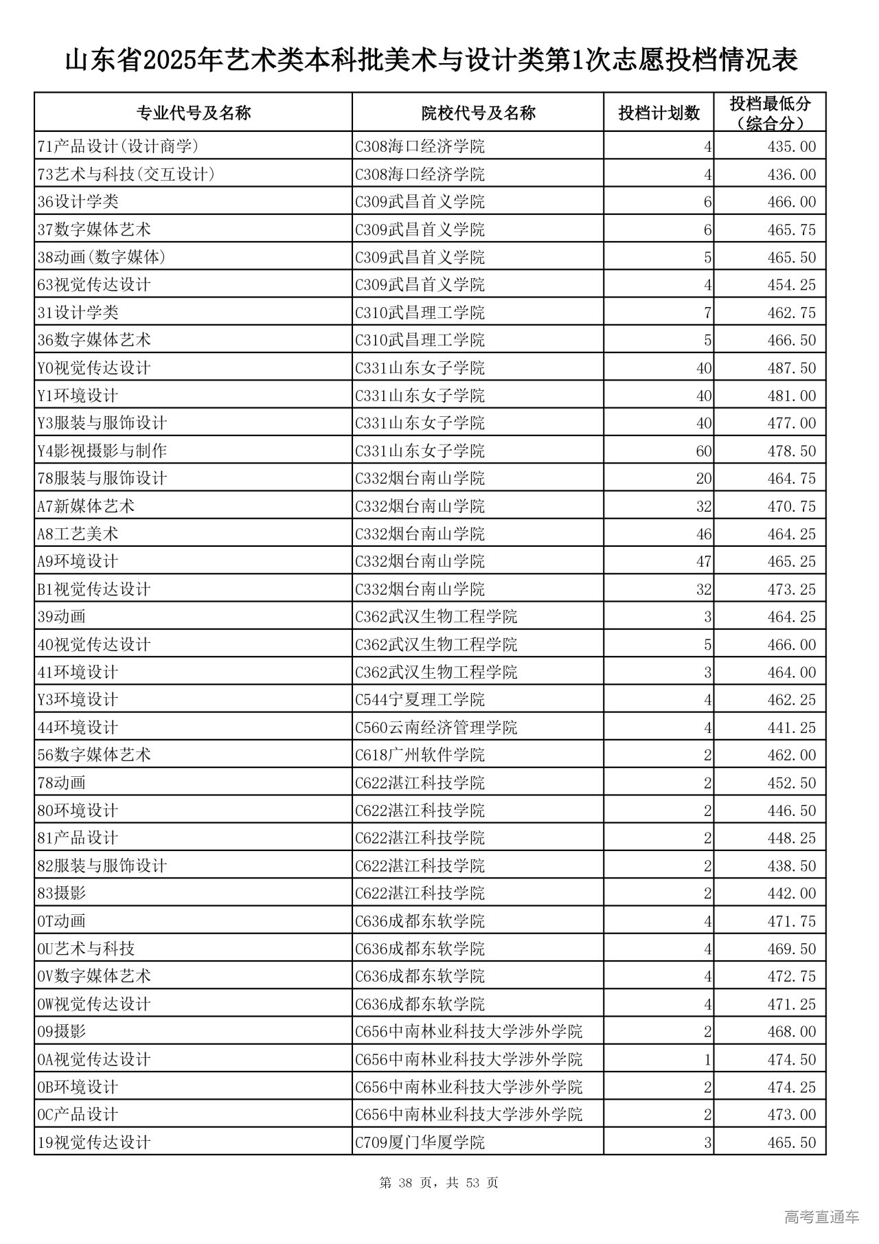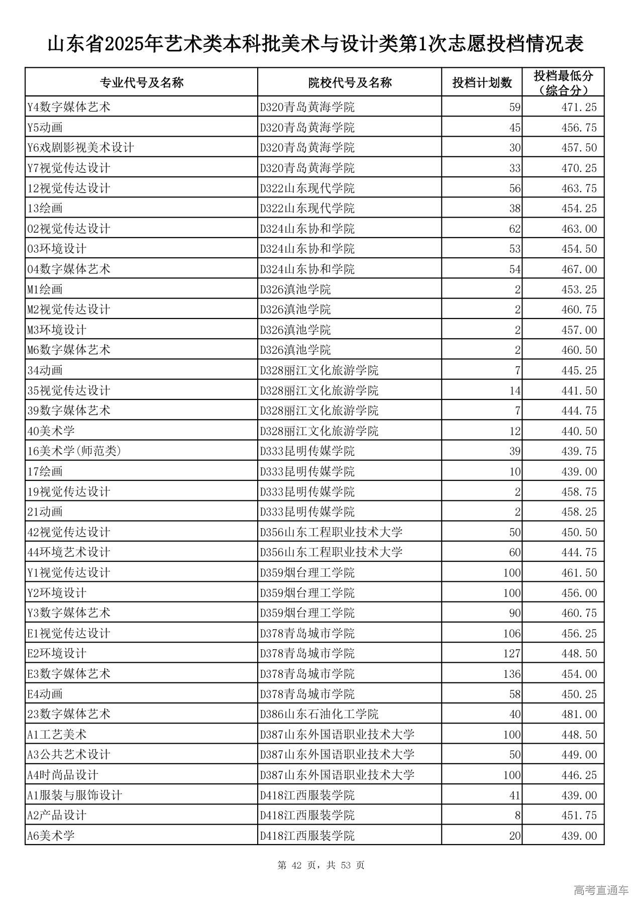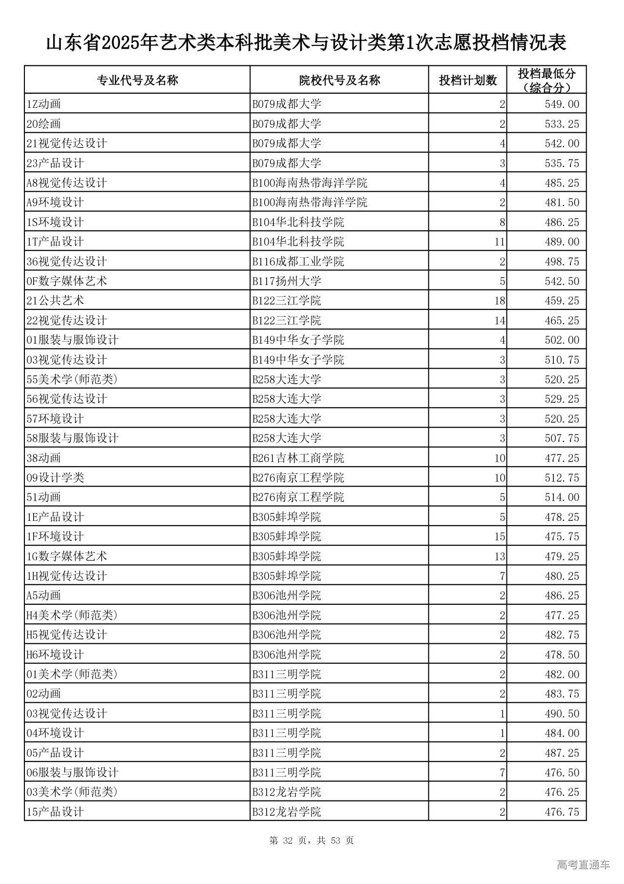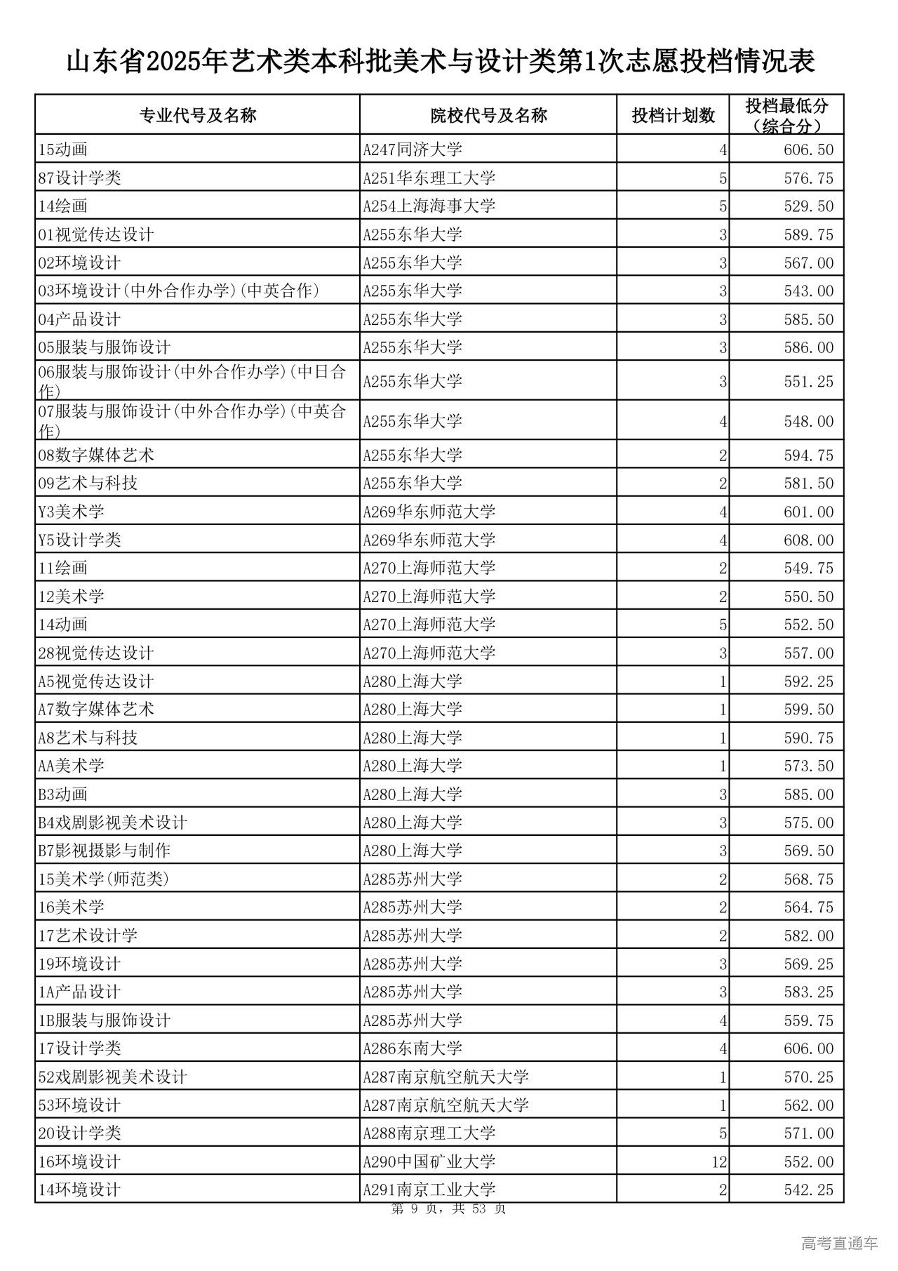 山东省2025年艺术类本科批美术与设计类第1次志愿投档情况表.xls