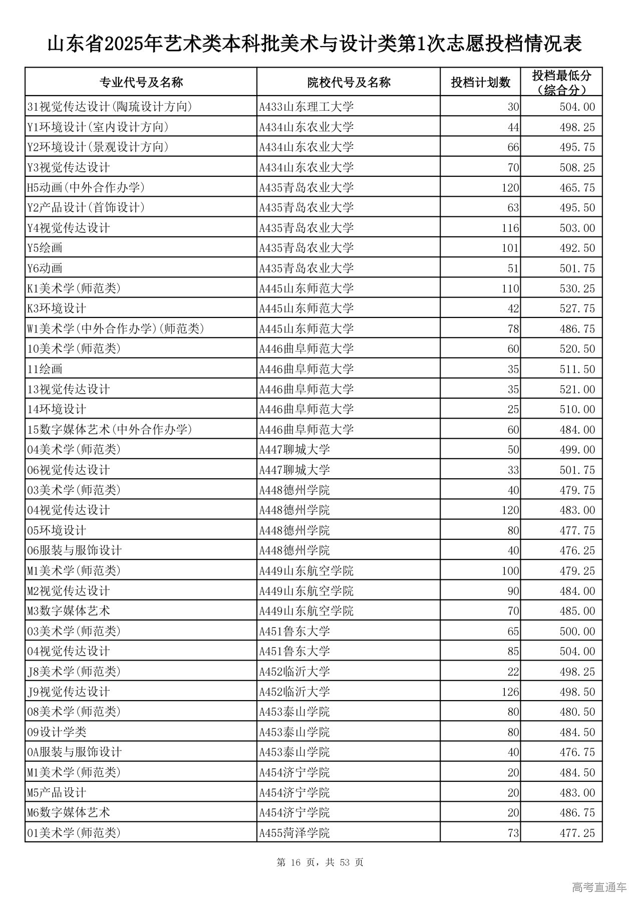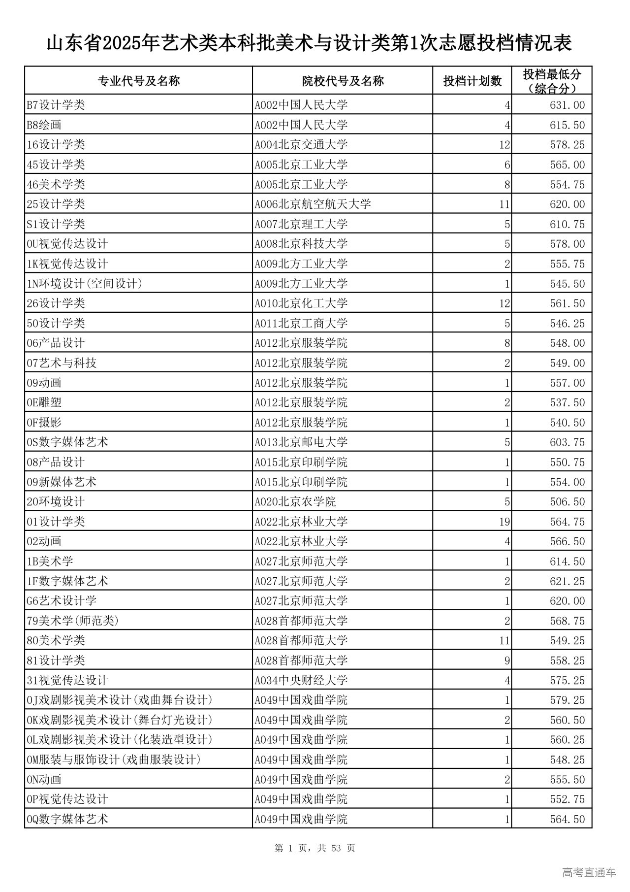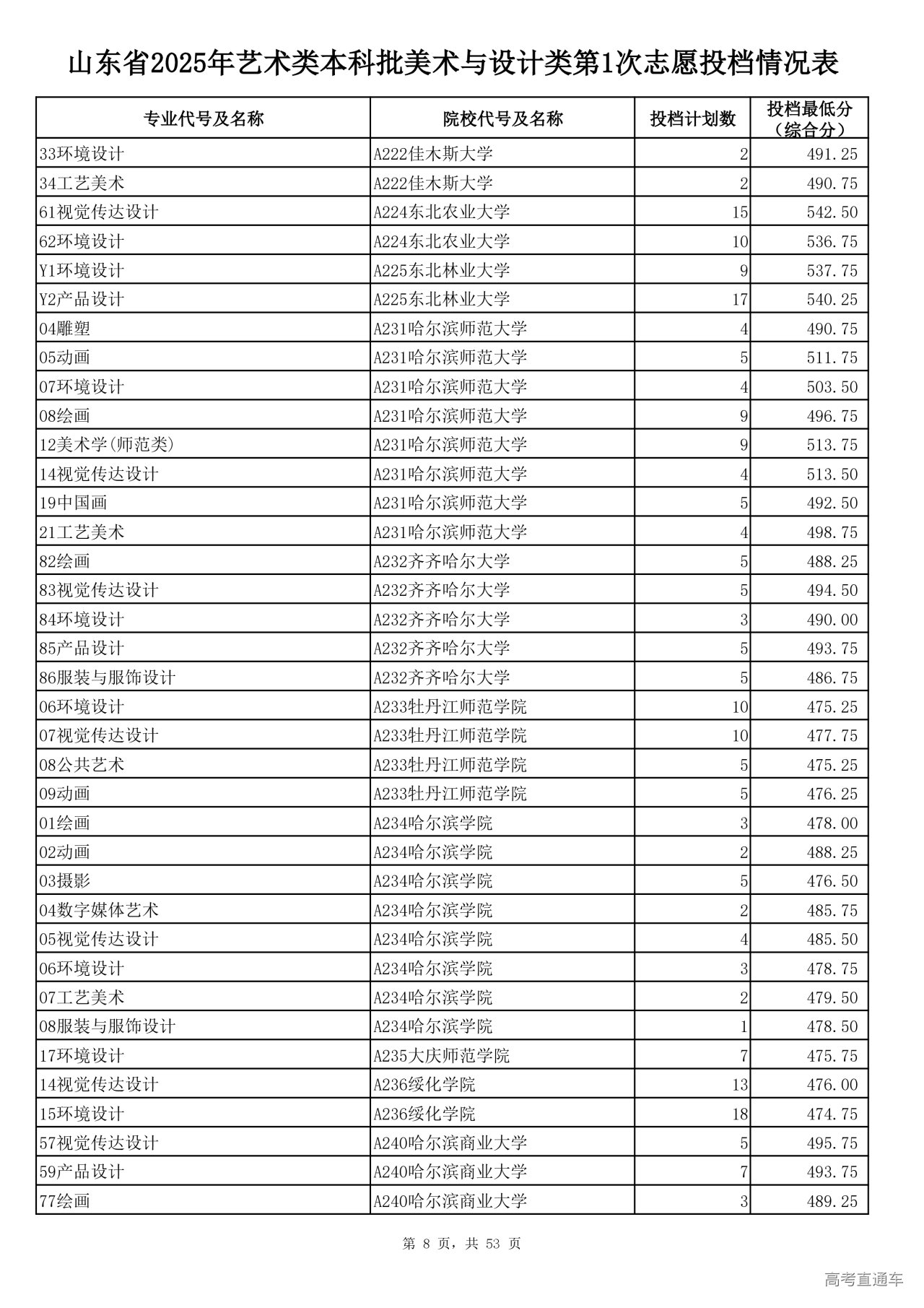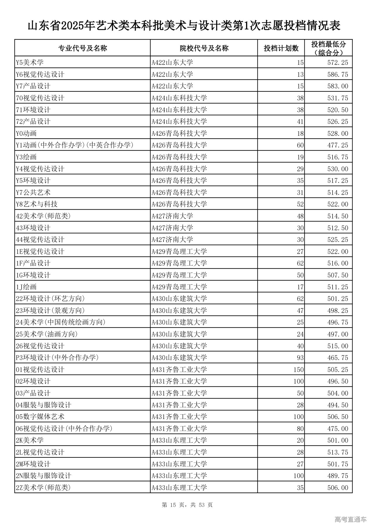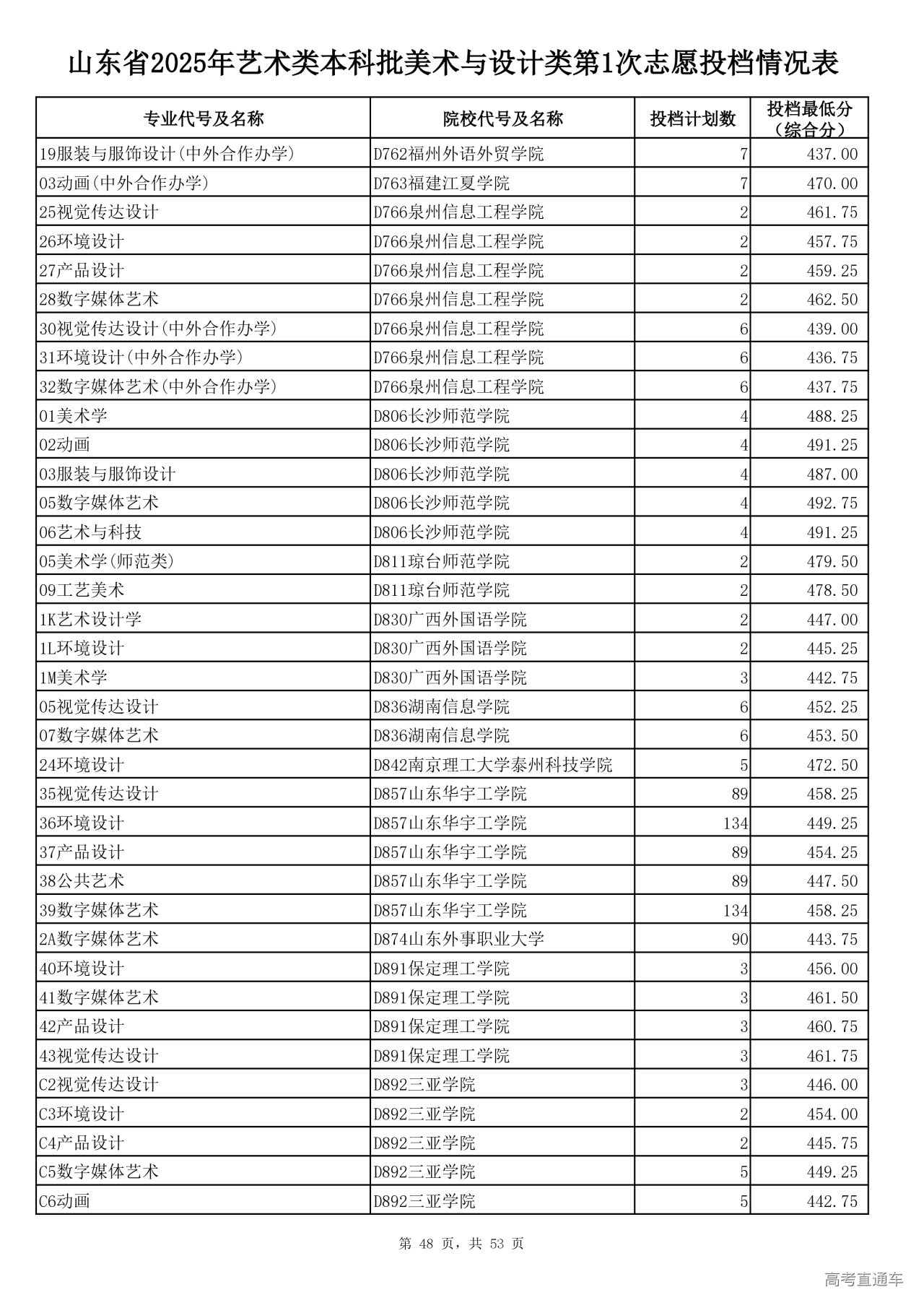 山东省2025年艺术类本科批美术与设计类第1次志愿投档情况表.xls