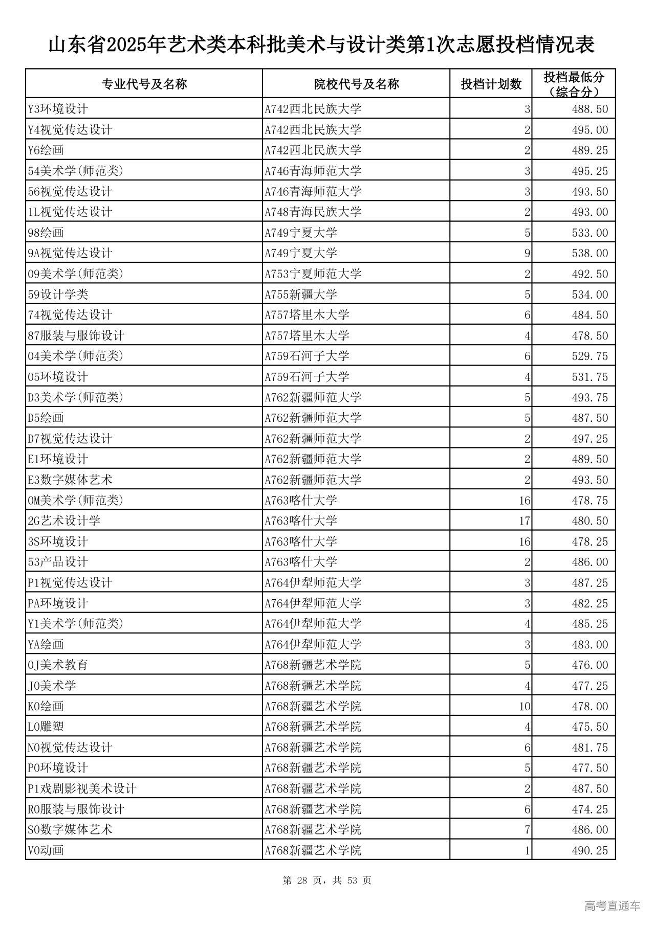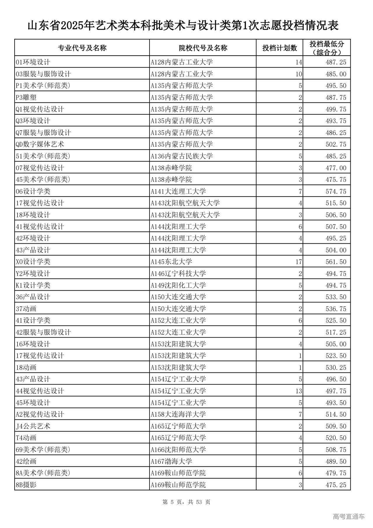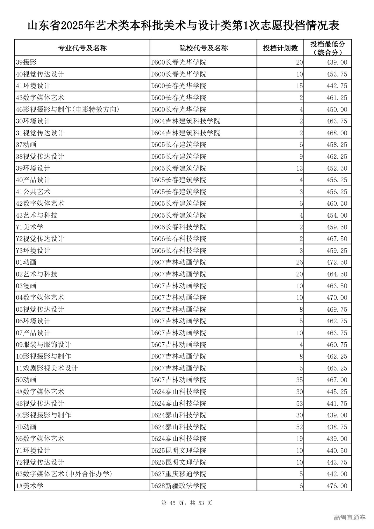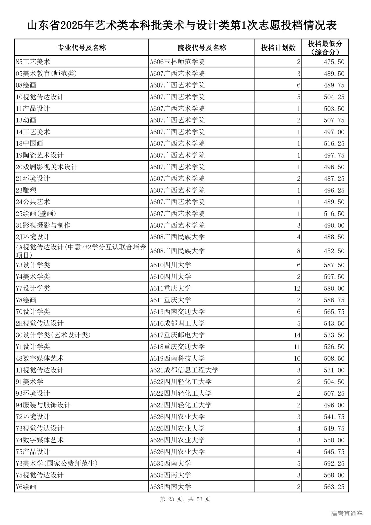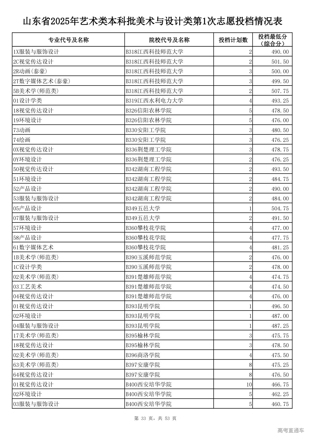 山东省2025年艺术类本科批美术与设计类第1次志愿投档情况表.xls