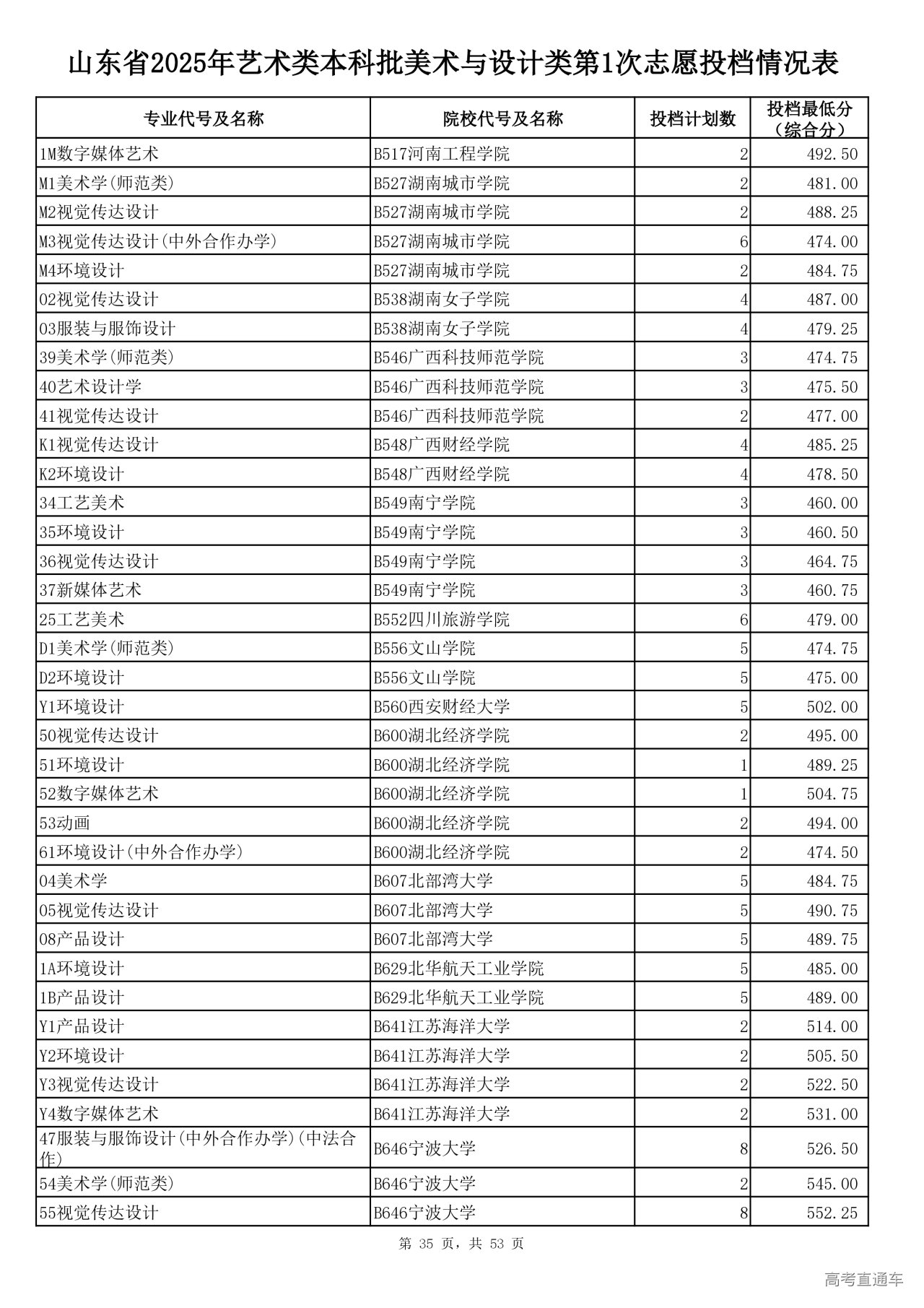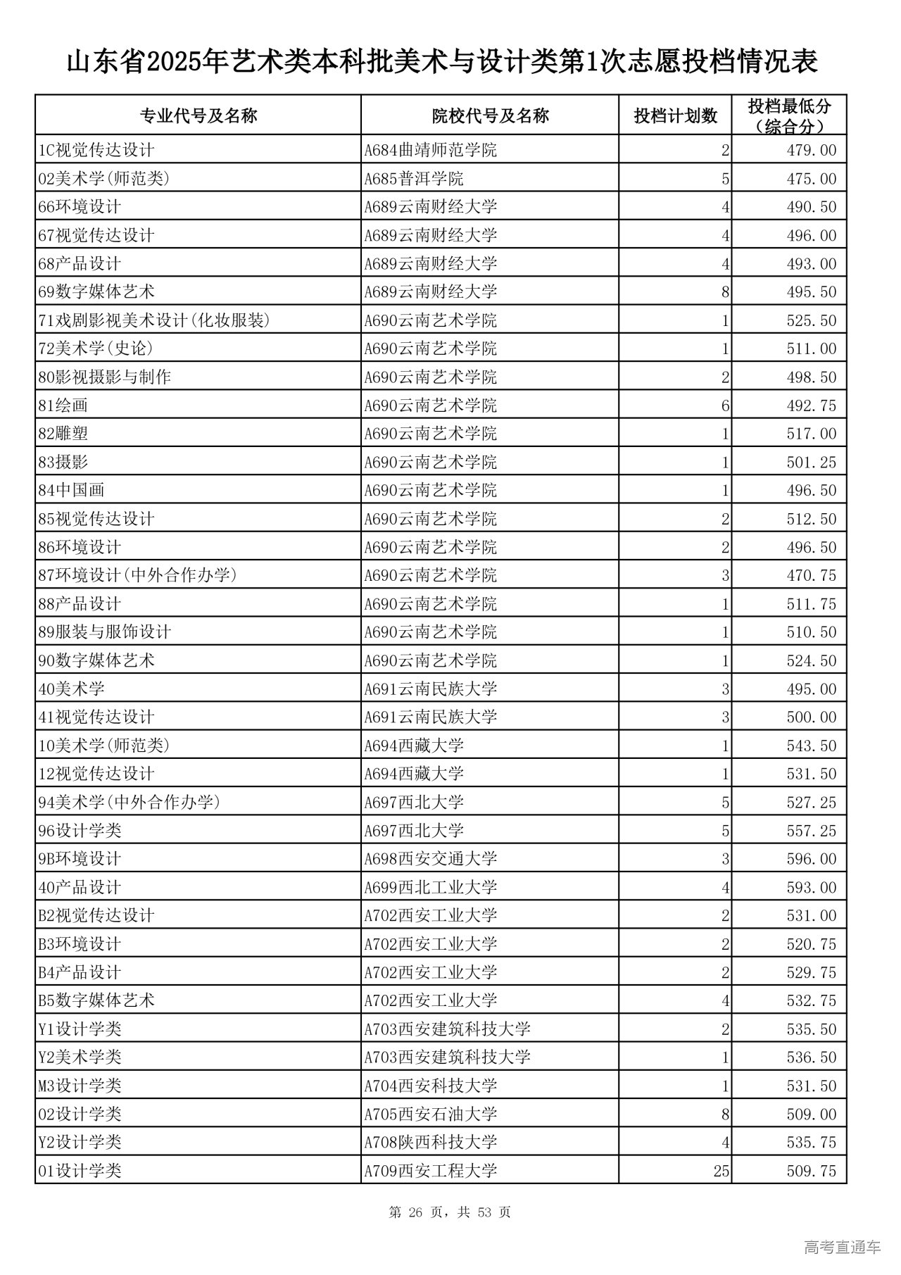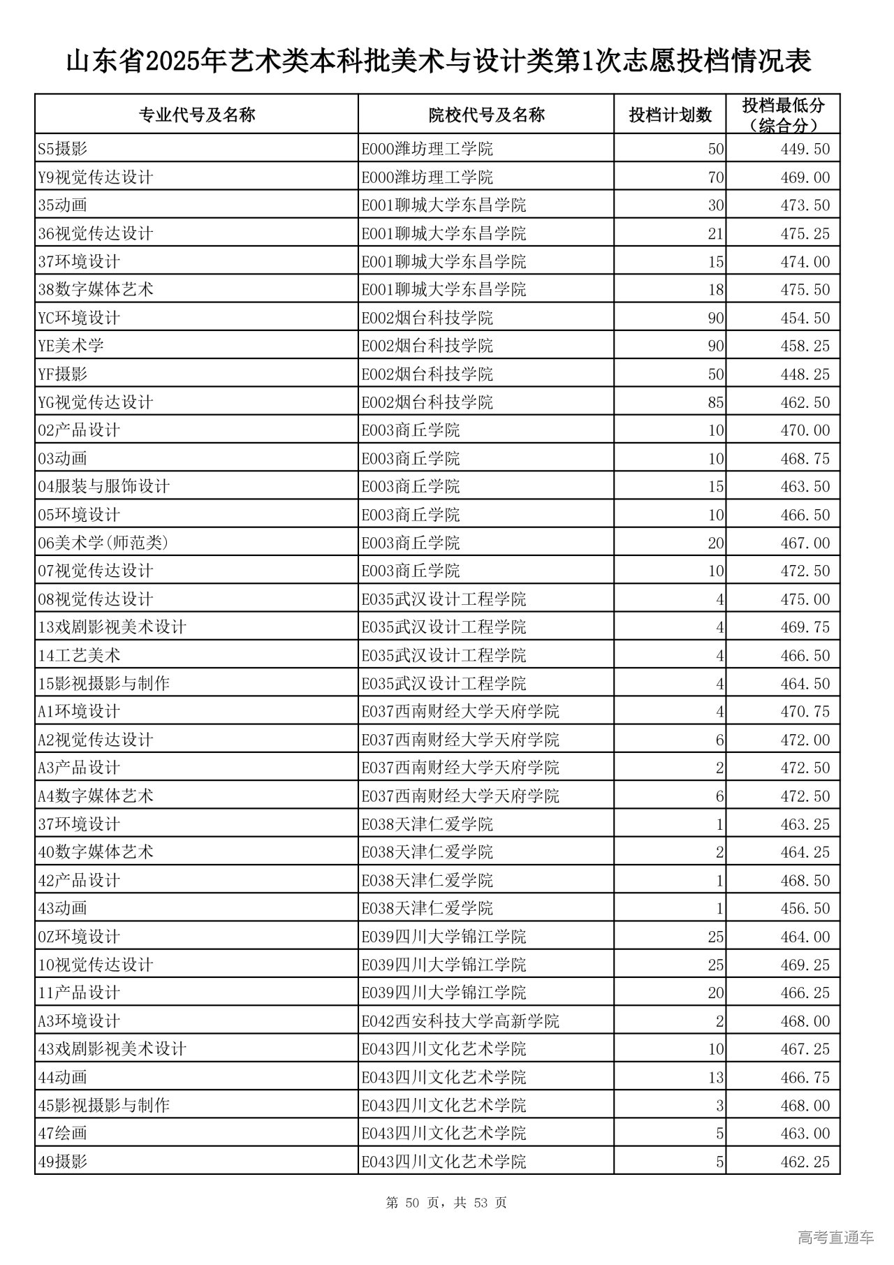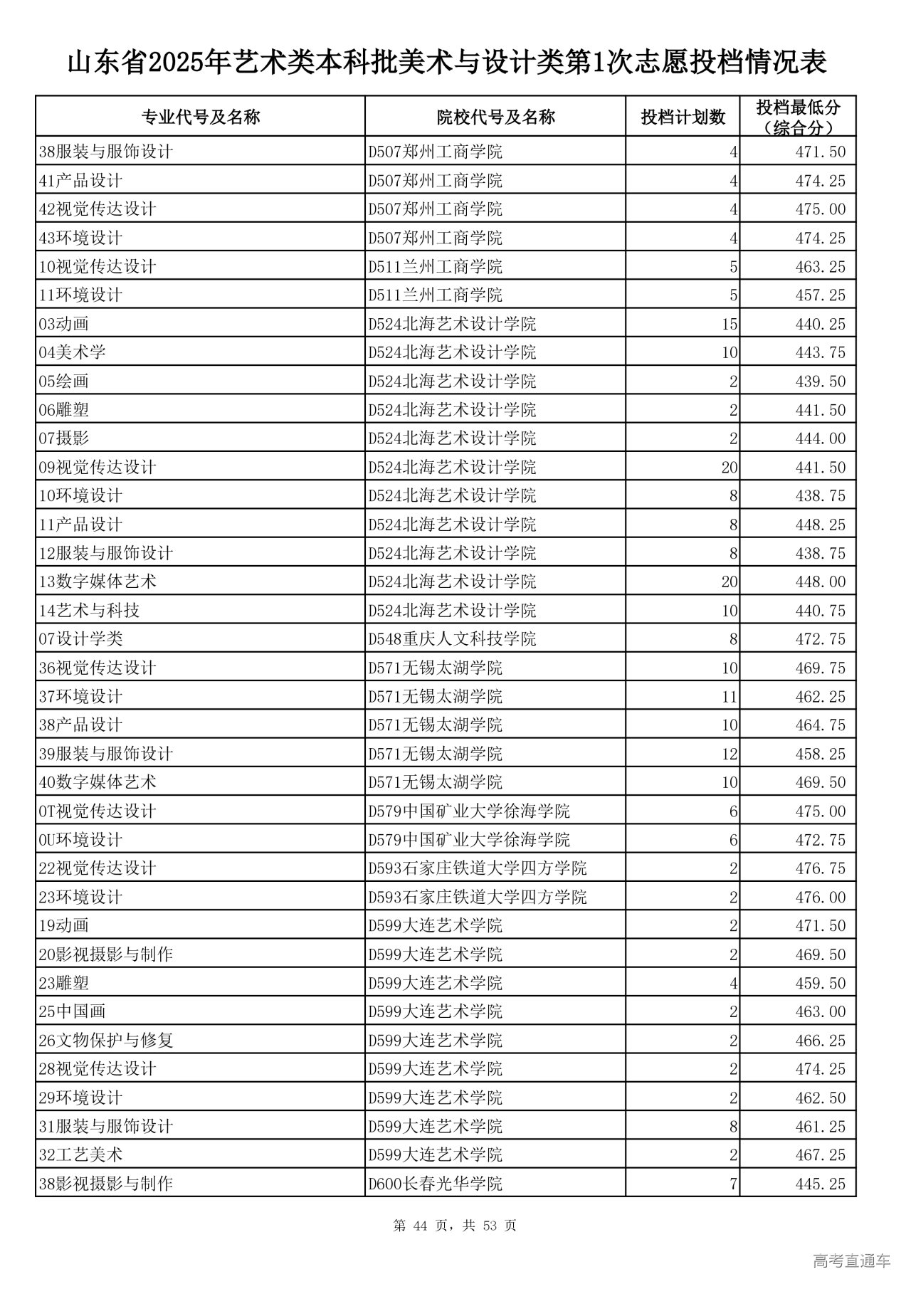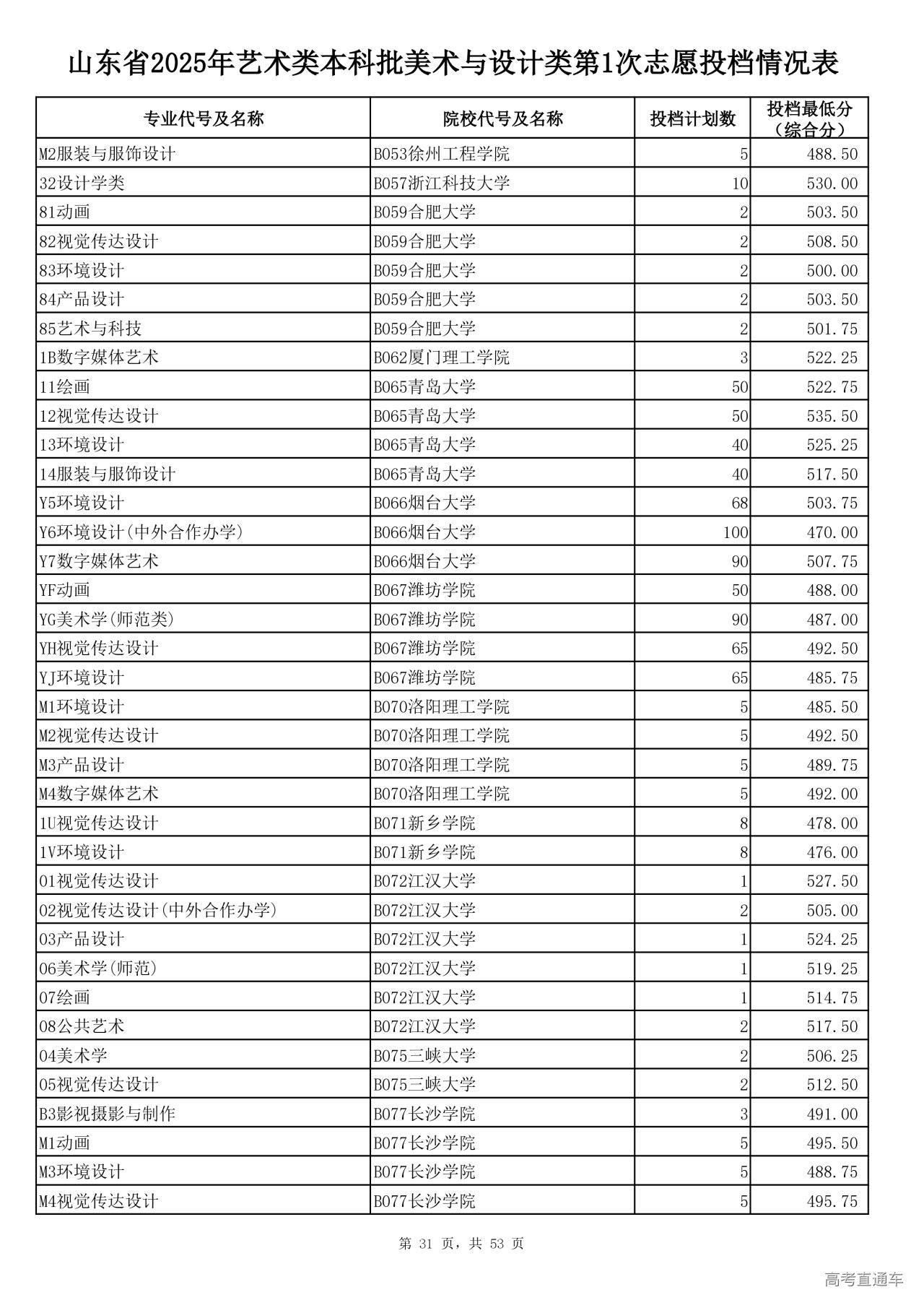 山东省2025年艺术类本科批美术与设计类第1次志愿投档情况表.xls