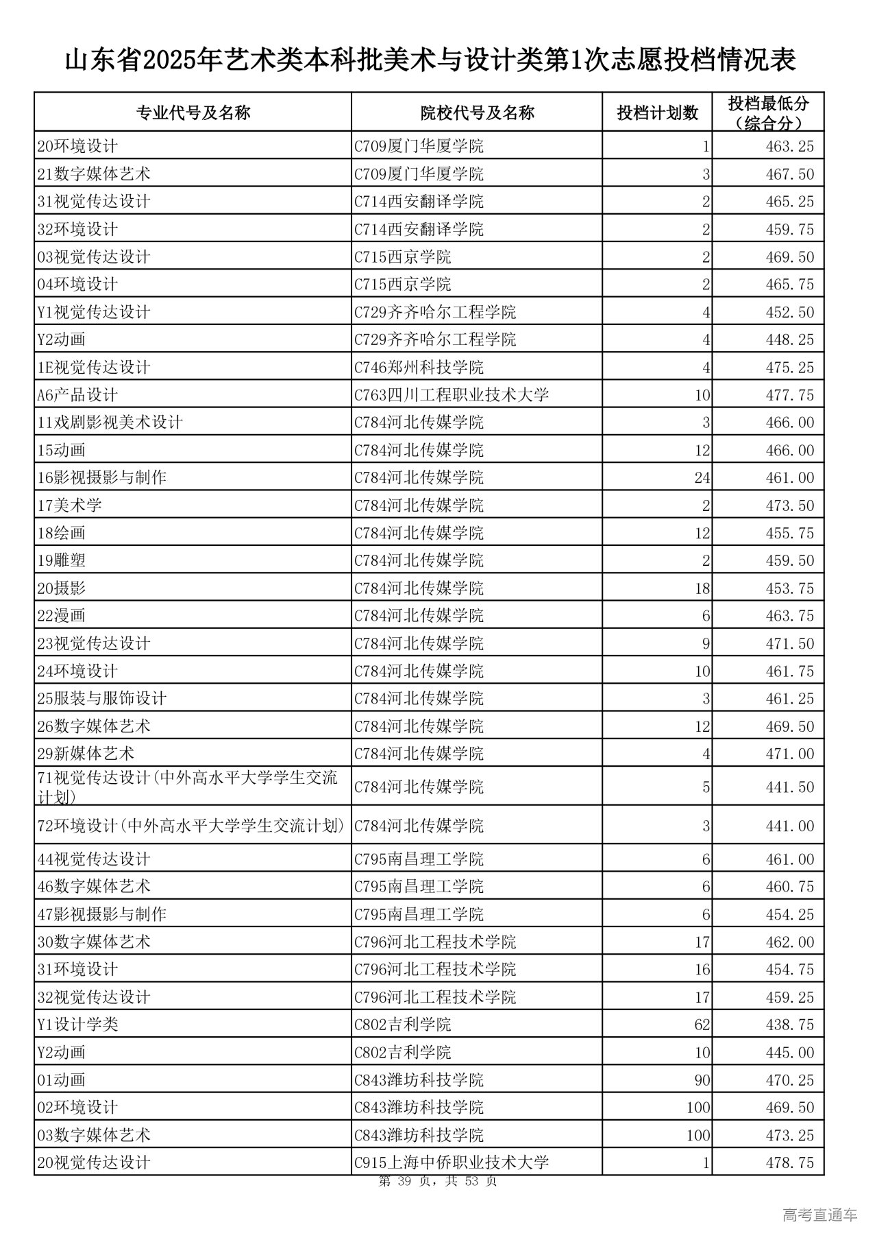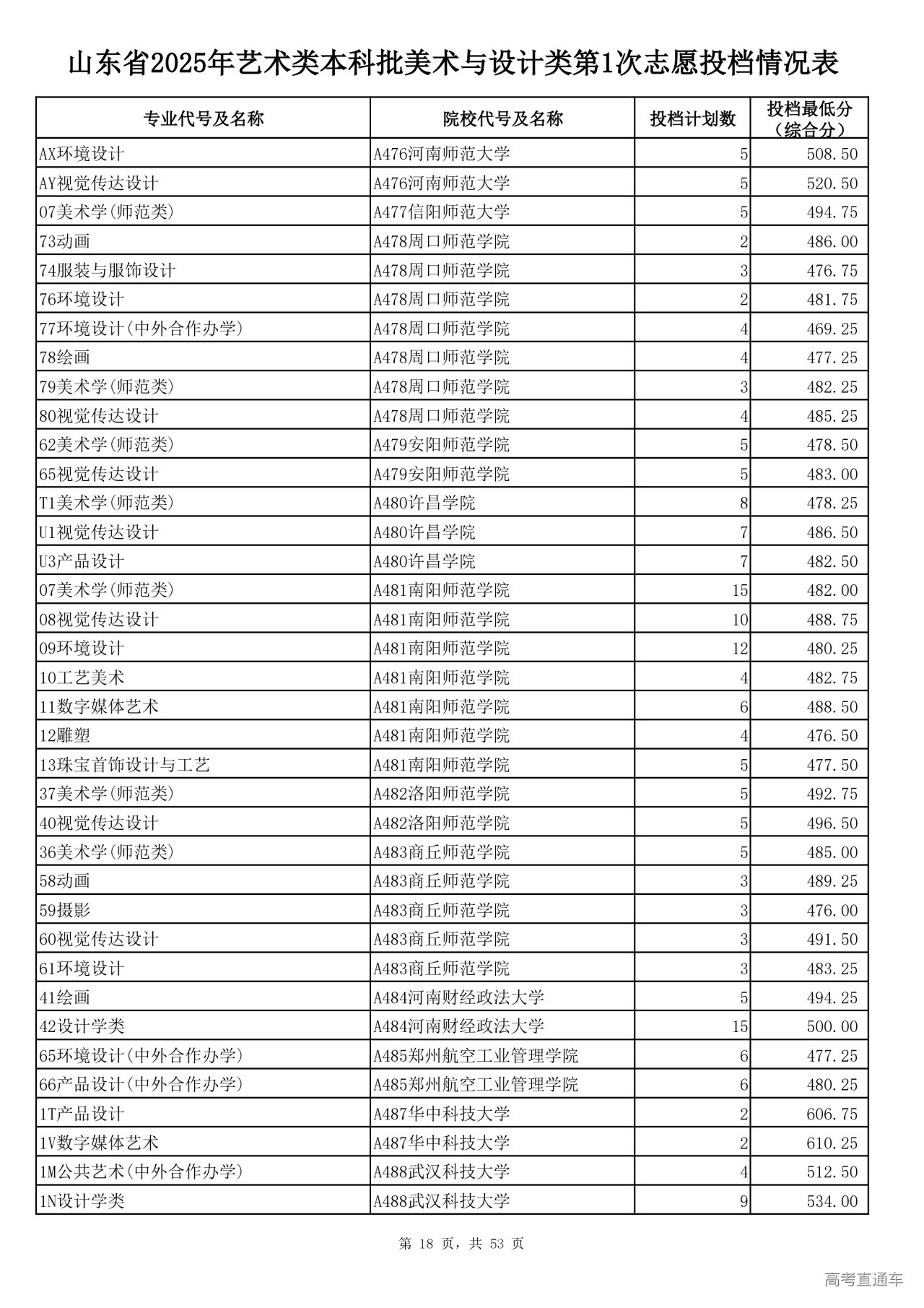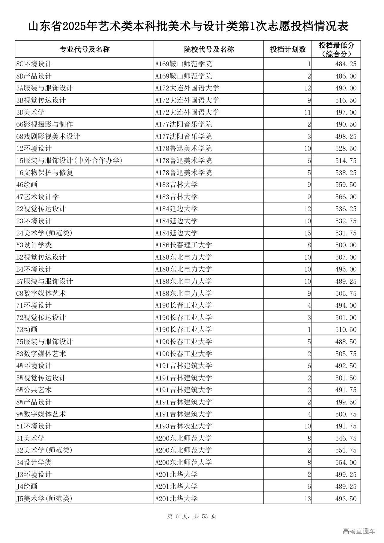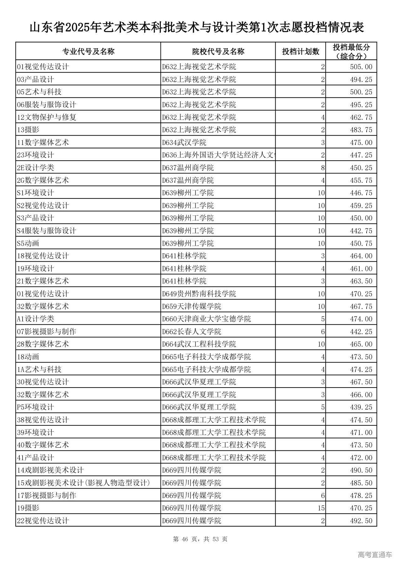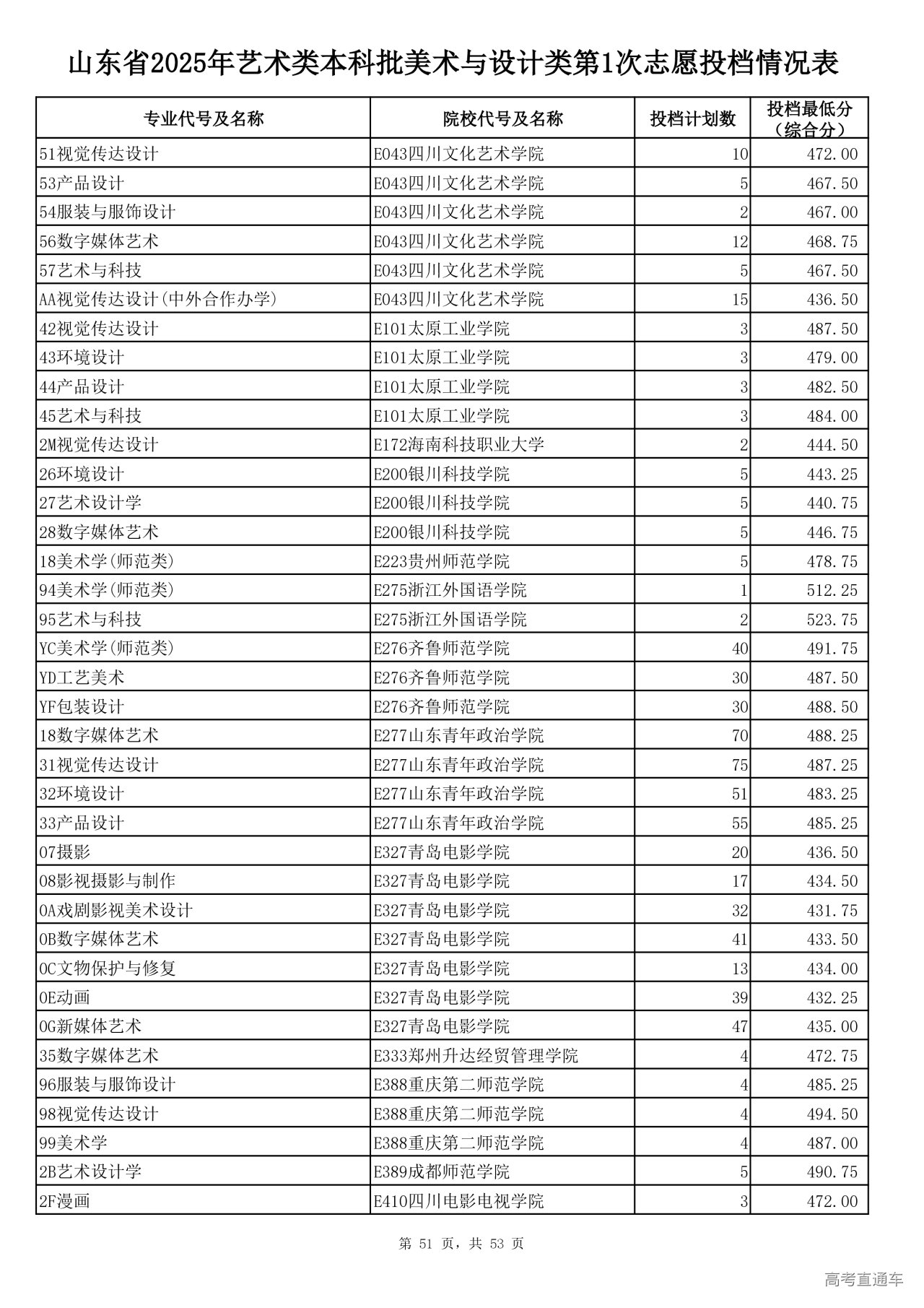 山东省2025年艺术类本科批美术与设计类第1次志愿投档情况表.xls