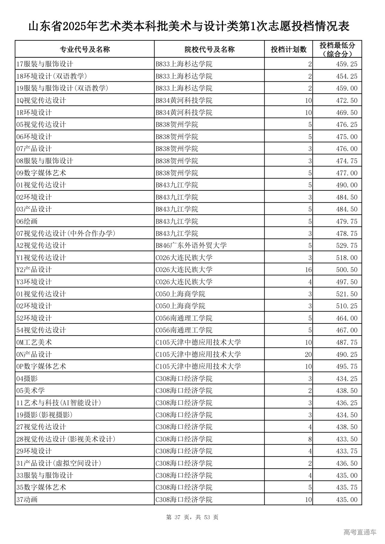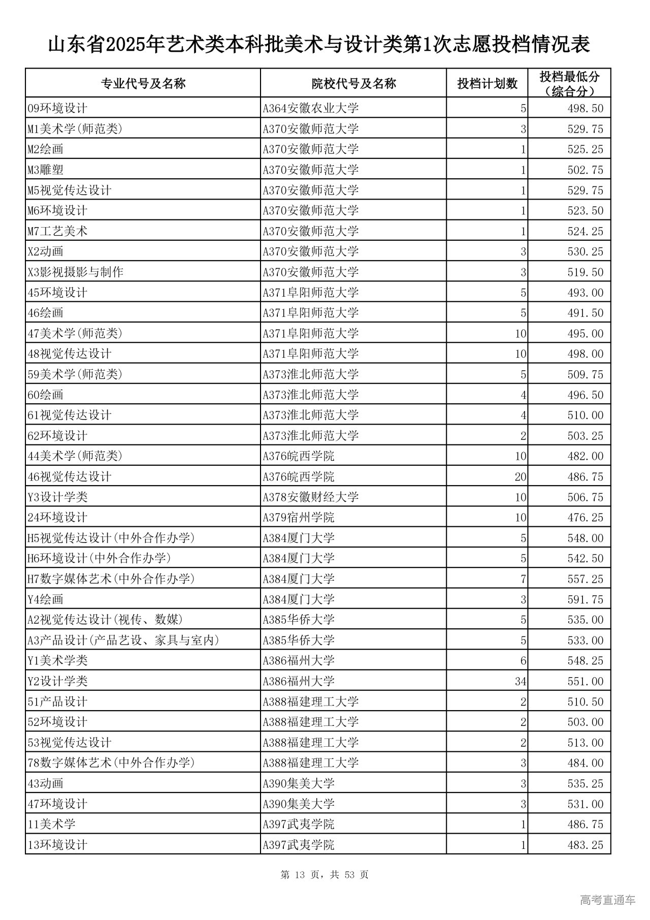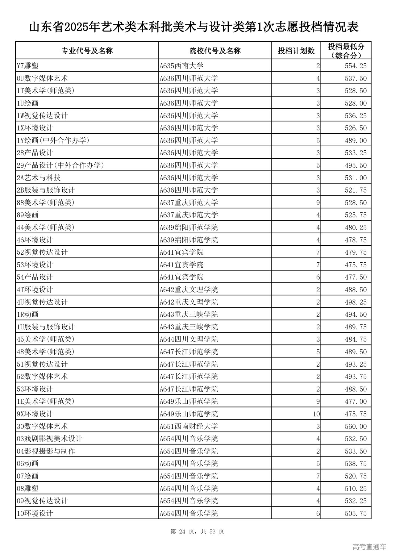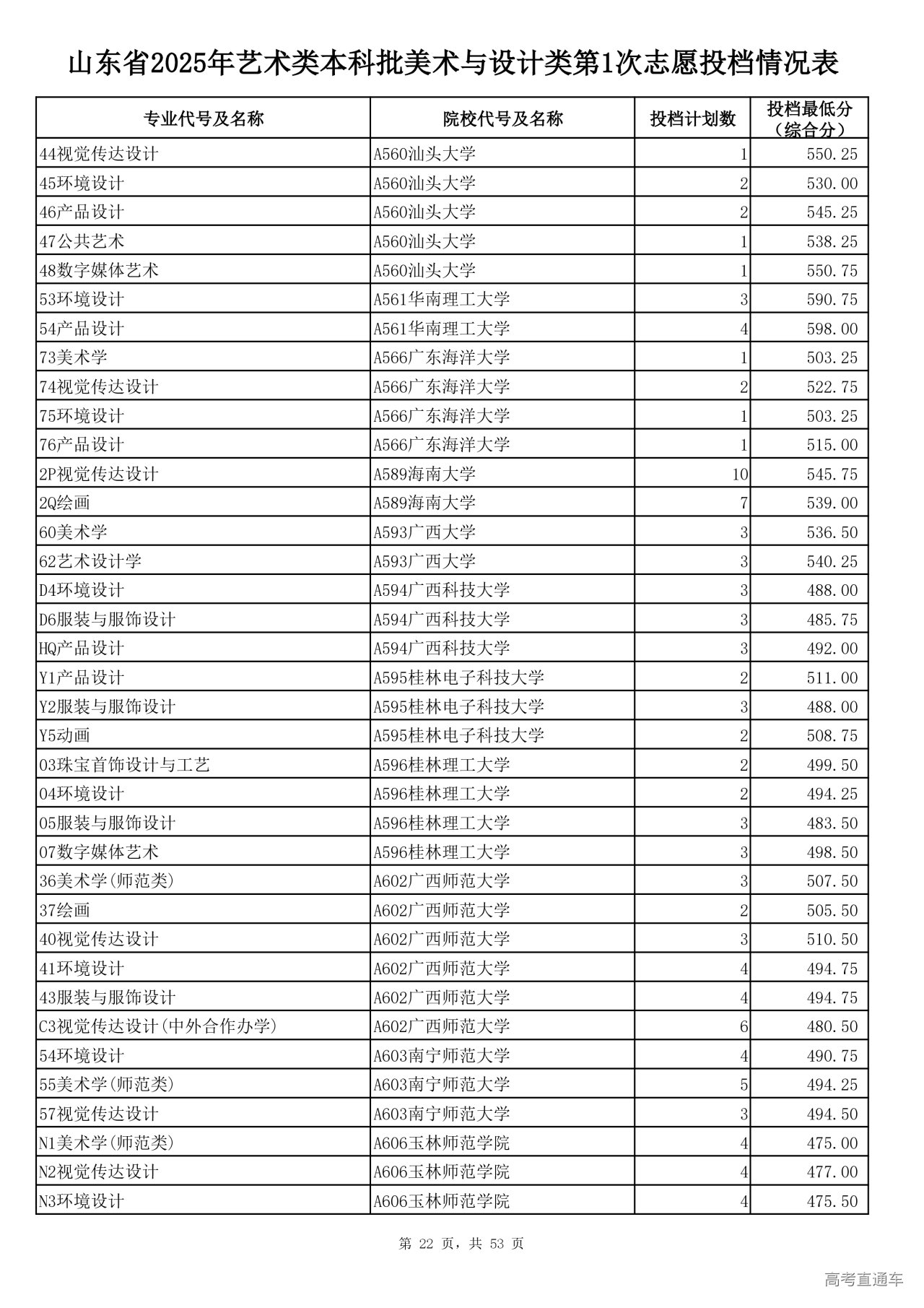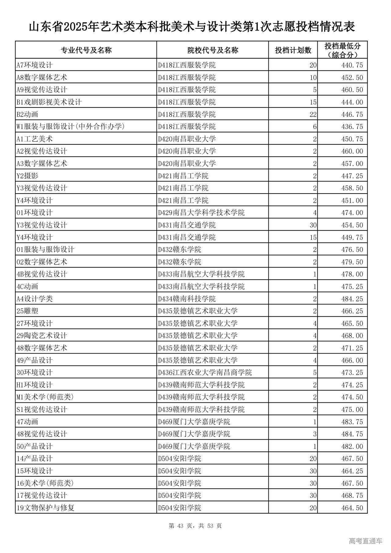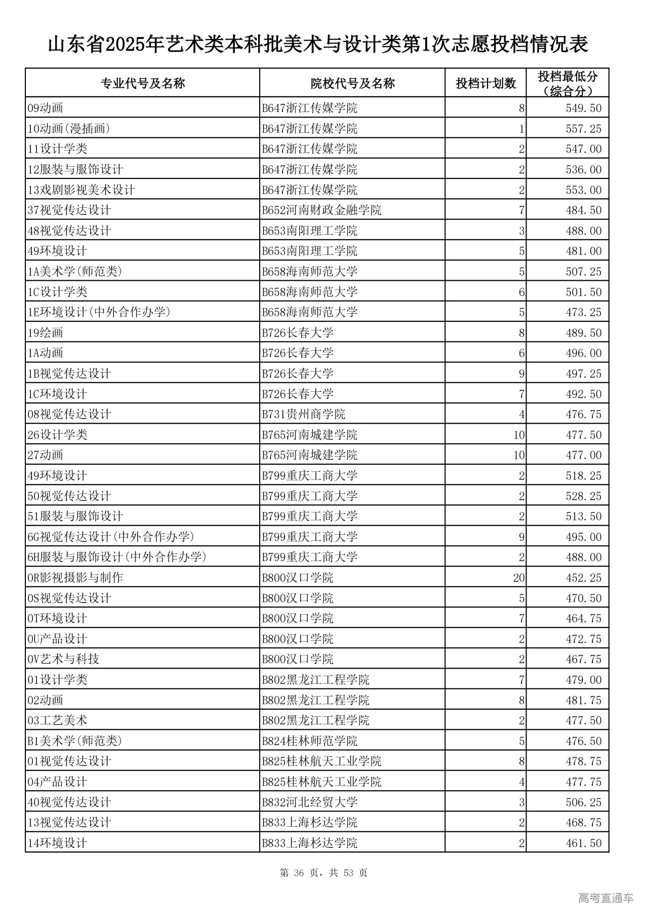 山东省2025年艺术类本科批美术与设计类第1次志愿投档情况表.xls