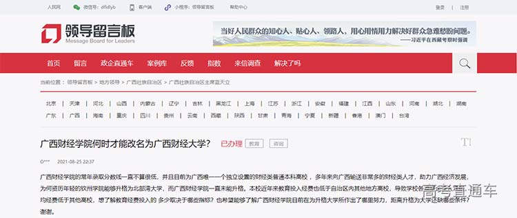 网友提问:广西财经学院的常年录取分数线一直不算很低,并且目前为广西唯一一个独立设置的财经类普通本科高校,多年来向广西输送非常多的财经类人才,助力广西经济发展,为何资历年轻的钦州学院能够升格为北部湾大学,而广西财经学院一直未能升格。本校近年来教育投入经费也低于自治区内其他地方高校,导致学校各项资金投入紧张,生均经费低于其他高校,想了解教育经费投入的多少取决于哪些指标?也希望能够了解广西财经学院目前在为升格大学所作出了哪里努力,距离升格为大学还缺哪些条件?