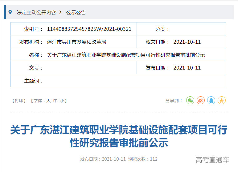 根据公示,这所新设的建筑类高职院校位于 吴川市覃巴镇覃文村草鞋岭,基础设施配套项目 总投资为3.5亿元。