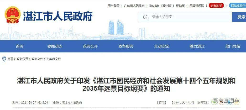 日前,湛江市人民政府发布关于印发《湛江市国民经济和社会发展第十四个五年规划和2035年远景目标纲要》的通知。