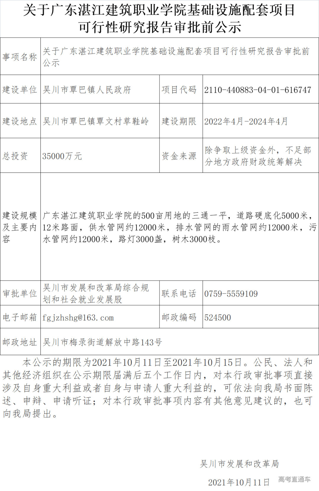 《纲要》中指出:支持 吴川市举办一所建筑类高等职业院校。10月11日, 吴川市发展和改革局网站发布《关于广东湛江建筑职业学院基础设施配套项目可行性研究报告审批前公示》。