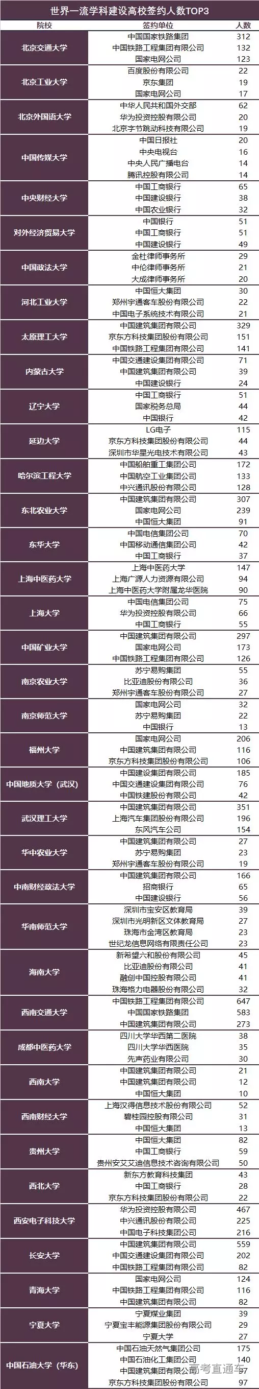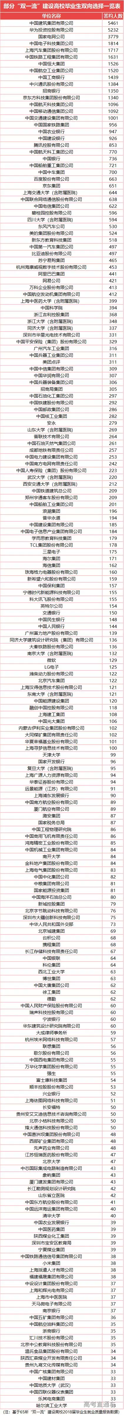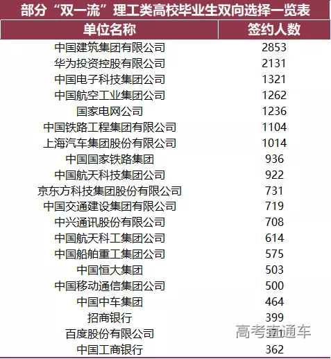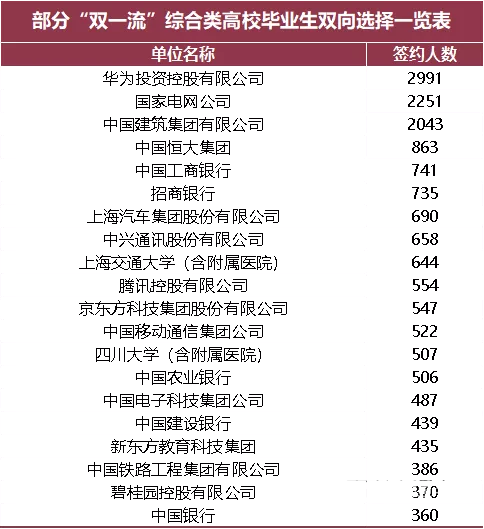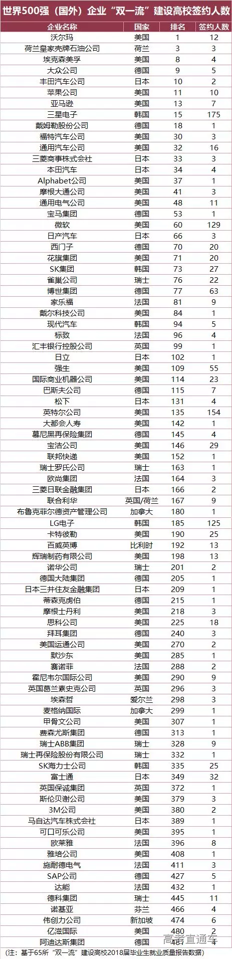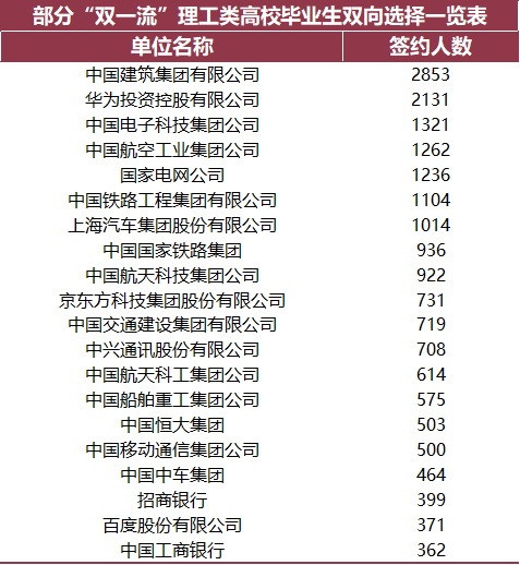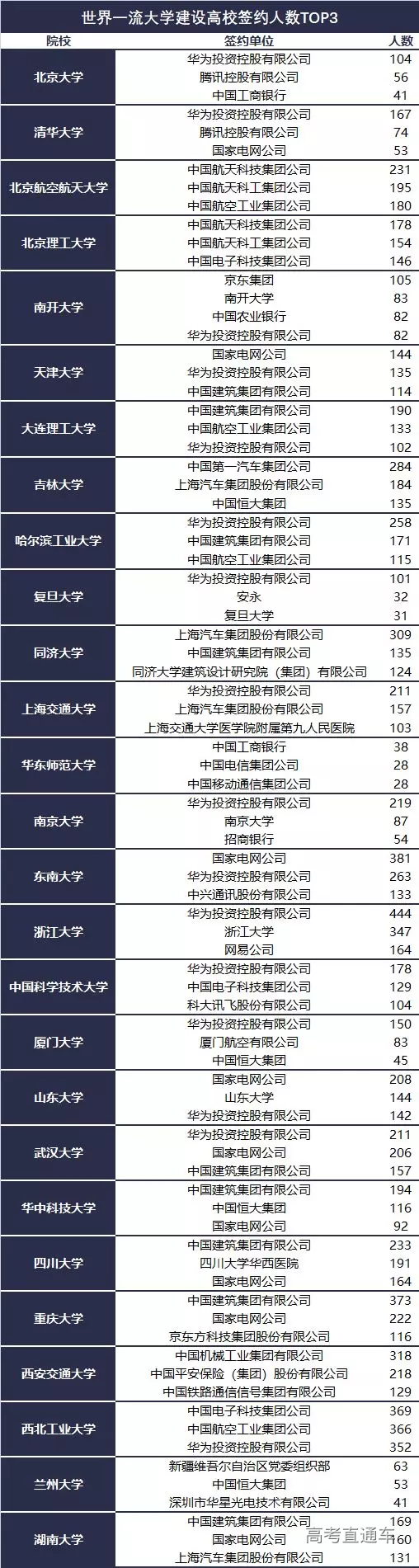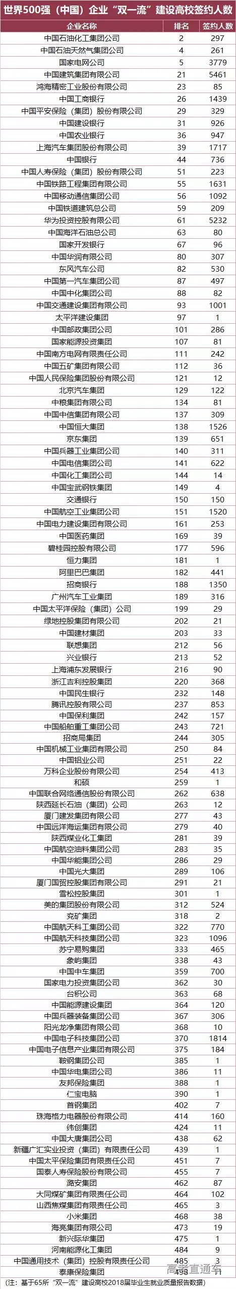 《财富》世界500强共有129家中国企业上榜,根据数据统计,2018“双一流”建设高校签约单位中有107家世界500强中国企业。其中签约人数前三的企业分别为: 中国建筑集团有限公司(5461人);华为投资控股有限公司(5232人);国家电网公司(3779人)。