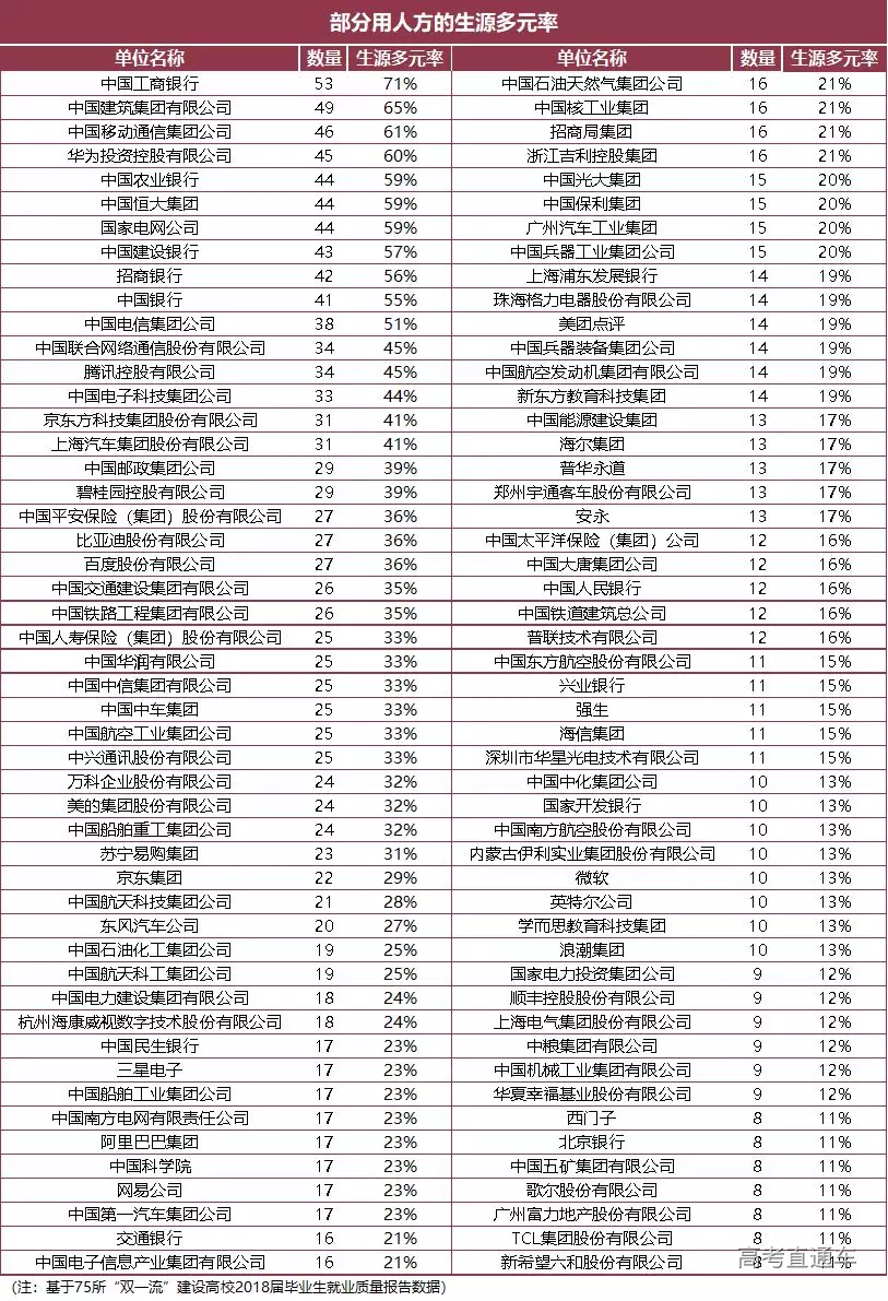 中国工商银行、中国建筑集团有限公司、中国移动、华为这四家用人单位招聘的毕业生分别来自75高校中的53所、49所、46所、45所(此处数据来源于75所公布签约单位的高校),多元化率分别是71%、65%、61%和60%。6-7成的“双一流”建设高校的毕业生有机会进入这些用人单位。