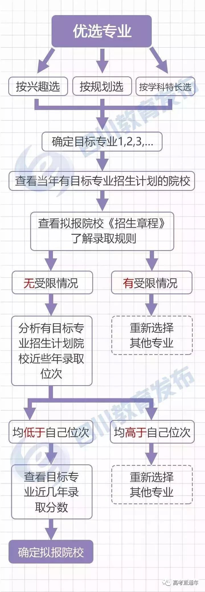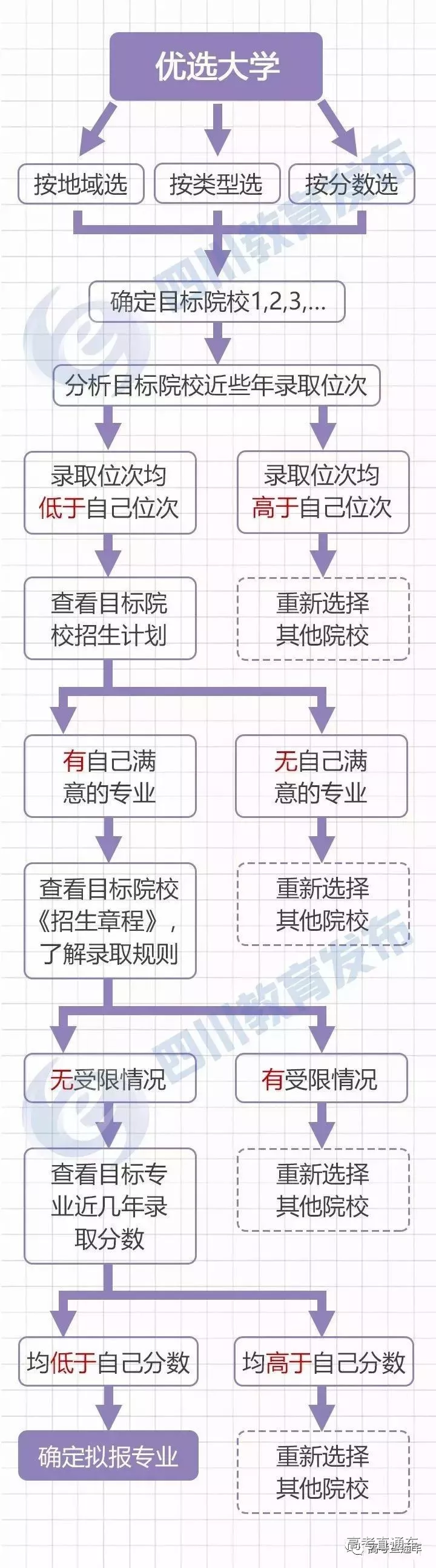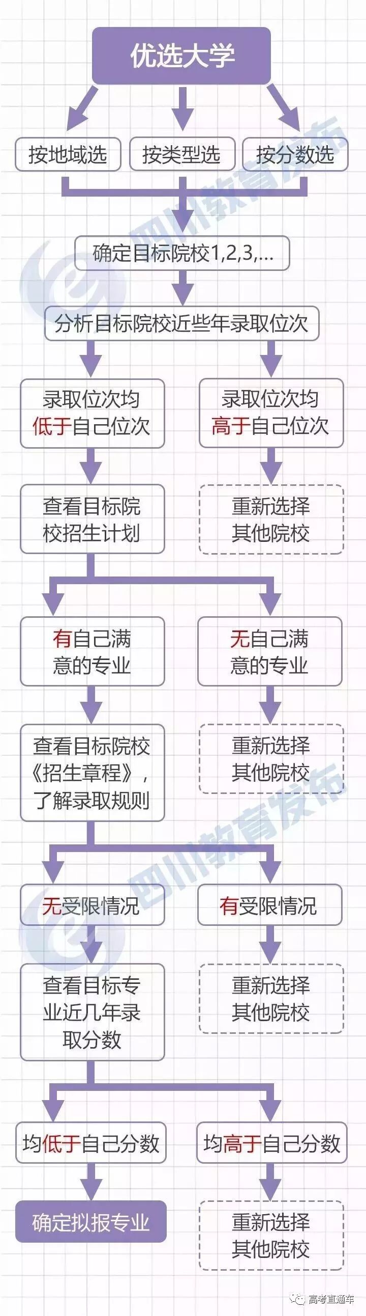 填志愿,首先要明白填报原则。是先选大学还是先选专业,如果你先选学校,那么请看这张图: