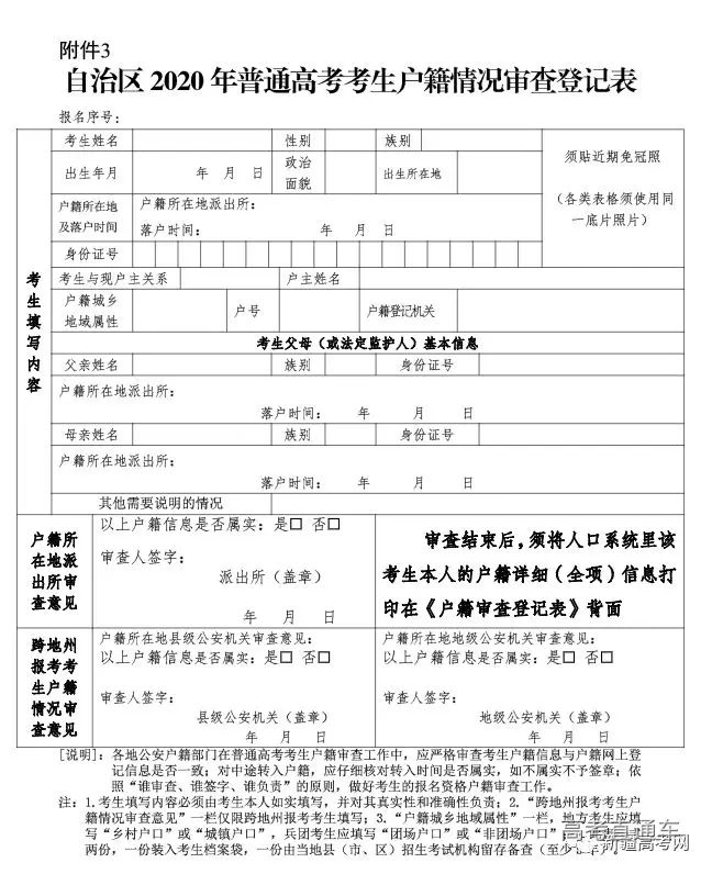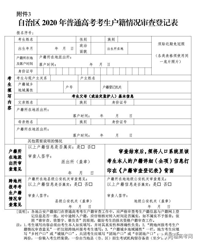 (三)各级公安人口管理部门具体负责辖区参加普通高考考生的户籍信息审查工作。认真核对居民户籍等有关登记项目信息的一致性,严格核查《自治区2020年普通高考考生户籍情况审查登记表》(以下简称《户籍审查登记表》)中考生及其父亲或母亲或其他法定监护人的相关信息与公安机关人口信息管理系统信息是否一致;对迁移户籍的,须仔细核对迁入时间是否属实。审查结束后,须将人口信息管理系统里该考生本人的户籍详细(全项)信息打印在《户籍审查登记表》背面。凡是违规、违法办理户籍迁移落户的,一律不予受理,已经落户的予以注销。属于社会人员伪造的,注意发现线索,依法给予严厉打击。属于公安机关内部民警违法乱纪的,按照有关规定严肃处理,触犯法律的依法追究法律责任。