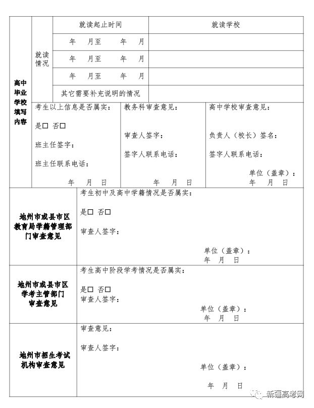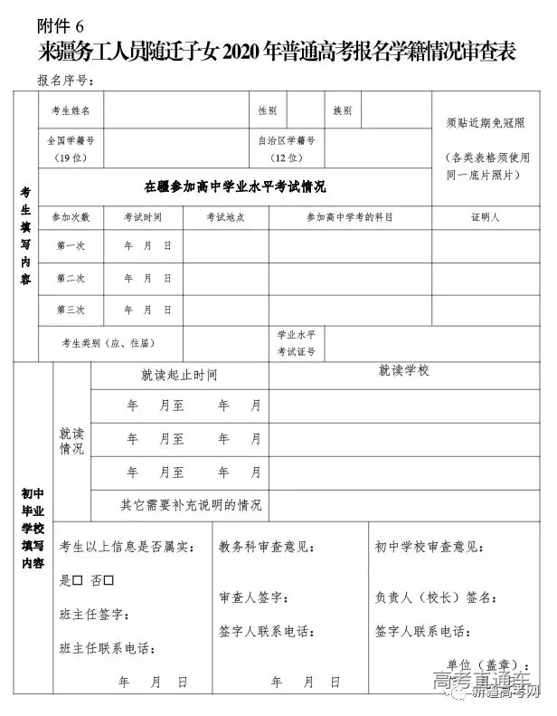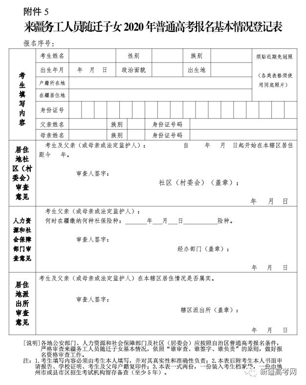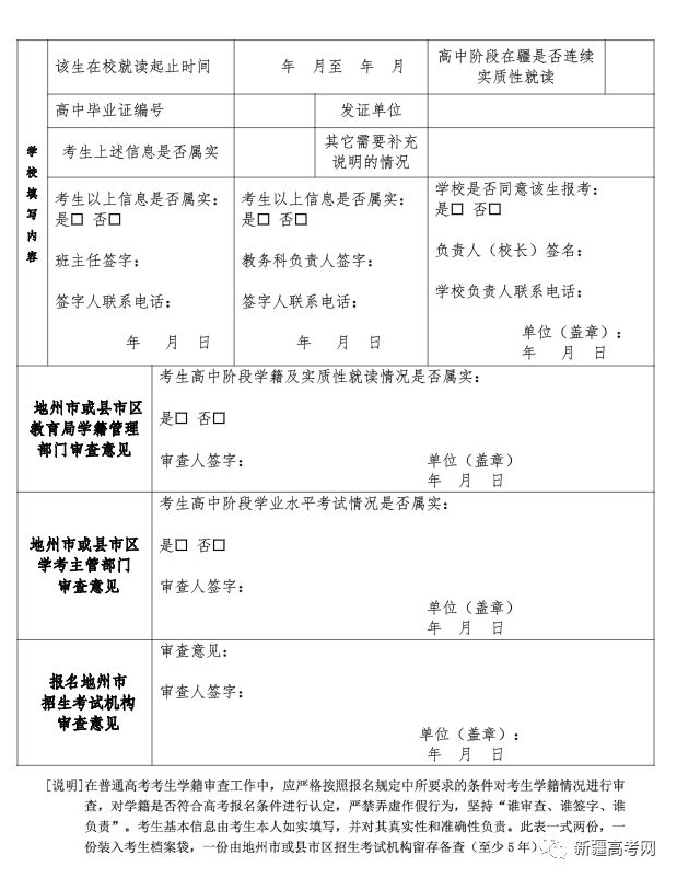 1.新疆跨地(州、市)就读考生,原则上回户籍所在地报名并参加考试,户籍所在地招生考试机构不得拒绝其报名。普通高中三年学籍完整的应届毕业生,经考生本人提出申请、就读所在普通高中证明学籍条件属实、户籍所在地(州、市)公安局户籍部门审查其户籍条件属实的,可在就读普通高中所在地(州、市)招生考试机构报名并参加考试。各地应相互配合加强对此类考生的资格审查和服务。