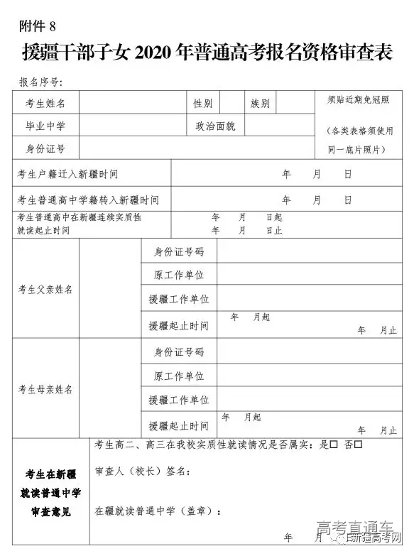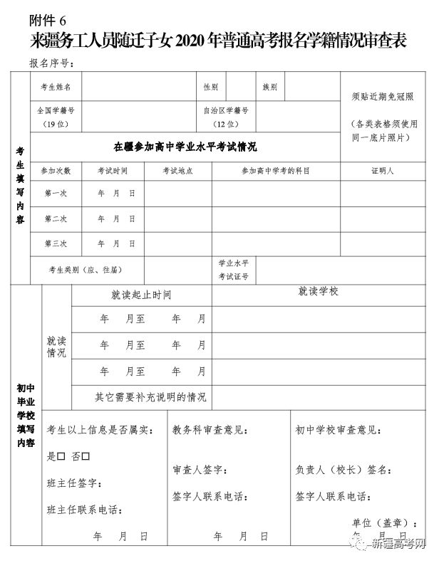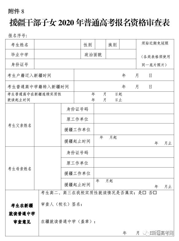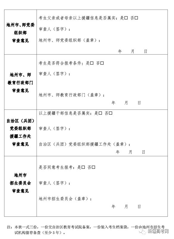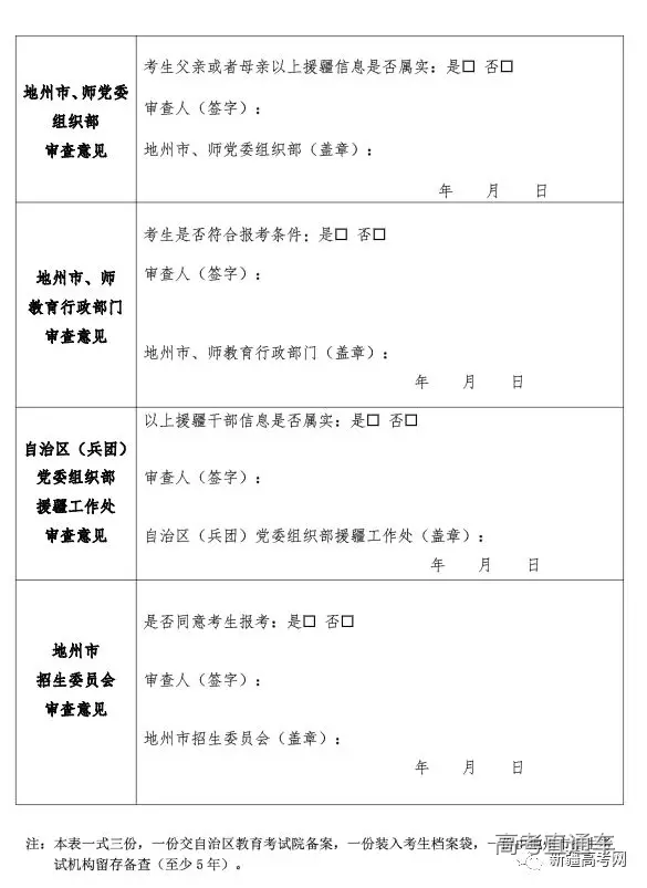 (6)区外地级以上(含地级)组织派遣或受聘在新疆工作三年以上(含三年)的专业技术人员、公务员在援疆工作期间,其子女普通高中阶段在疆连续实质性就读两年(高二、高三)并且有在疆就读两年的学籍档案,子女本人是新疆常住户籍人口,允许在疆报考(须由组织部门出具父(母)援疆派遣手续等相关证明材料)。非兵团系统,可由考生户籍所在地地级(含地级)以上党委组织部门出具证明材料,经考生户籍所在地(州、市)招生委员会批准,同时报自治区教育考试院备案后准予报名;兵团系统,可由新疆生产建设兵团师级(含师级)以上党委组织部门出具证明材料,经考生就学所在地(州、市)招生委员会批准,同时报自治区教育考试院备案后准予报名。