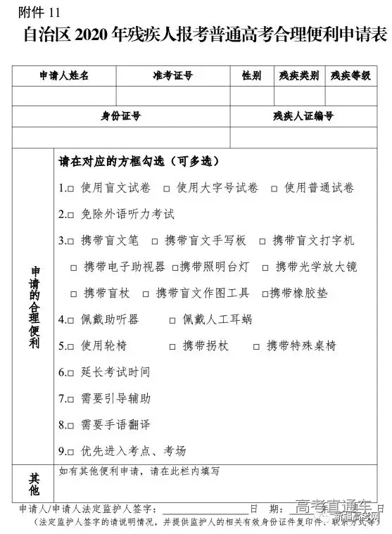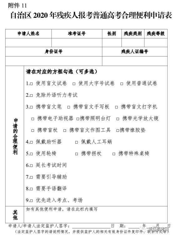 4.按照《教育部 中国残疾人联合会关于印发残疾人参加普通高等学校招生全国统一考试考务规定》(教学〔2017〕4号)要求,符合我区高考报名条件、需要招生考试机构提供合理便利予以支持帮助的残疾考生,须按规定填写《自治区残疾人报考普通高考合理便利申请表》,并提供有关证件和材料。申请使用盲文试卷的盲人考生还须签订承诺同意使用全国统一命制的盲文试卷的承诺书。