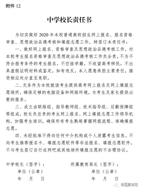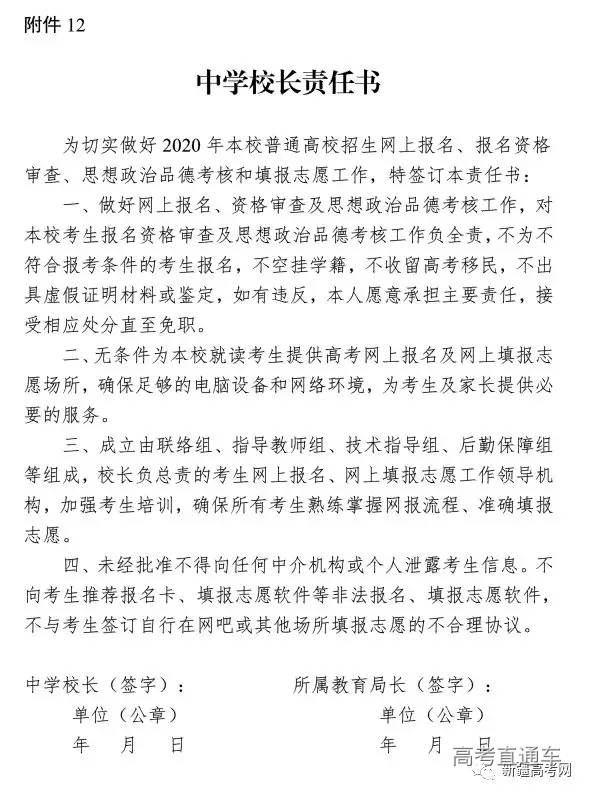 5.各级招生考试机构和高级中等教育学校要加强考生的诚信教育和警示教育。考生在申请报名时,须签订诚信承诺书,承诺本人所填写内容、提供的相关证明材料客观、真实、准确,承诺参加招生考试时遵守有关管理规定。