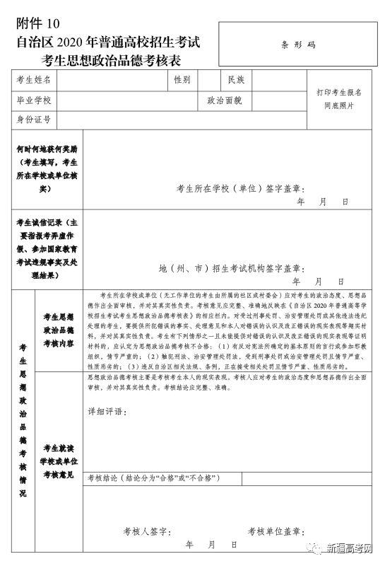 思想政治品德考核主要是考核考生本人的现实表现,考核结论分为“合格”“不合格”。考生所在学校或单位(无工作单位的考生由所属的社区或村委会)应对考生的政治态度、思想品德作出全面审核,并对其真实性负责。考核意见应完整、准确地反映在《自治区2020年普通高等学校招生考试考生思想政治品德考核表》的相应栏内。对受过刑事处罚、治安管理处罚或其他违法违纪处理的考生,要提供所犯错误的事实、处理意见和本人对错误的认识及改正错误的现实表现等翔实材料,并对其真实性负责。考生有下列情形之一且未能提供对错误的认识及改正错误的现实表现等证明材料的,应认定为思想政治品德考核不合格:(1)有反对宪法所确定的基本原则的言行或参加邪教组织,情节严重的;(2)触犯刑法、治安管理处罚法,受到刑事处罚或治安管理处罚且情节严重、性质恶劣的;(3)违反自治区相关法规、条例,正在接受相关处罚且情节严重、性质恶劣的。