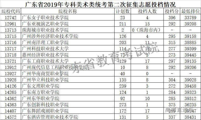 广东省2019年专科美术类统考第二次征集志愿投档情况