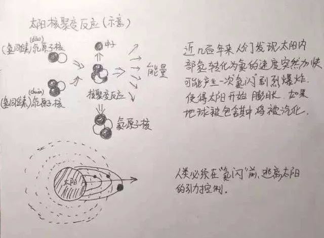 原著:“太阳内部氢转化为氦的速度突然加快,太阳的演化已向主星序外偏移,氦元素的聚变将在很短的时间内传遍整个太阳内部,由此产生一次叫氦闪的剧烈爆炸”。