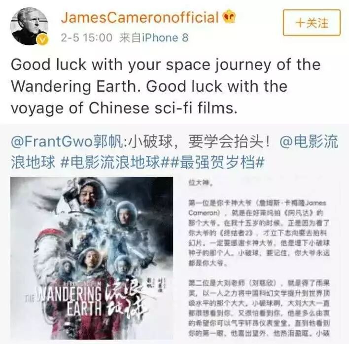 一路走来,这部电影终于得到了行业大咖卡梅隆大帝的认可和赞誉。