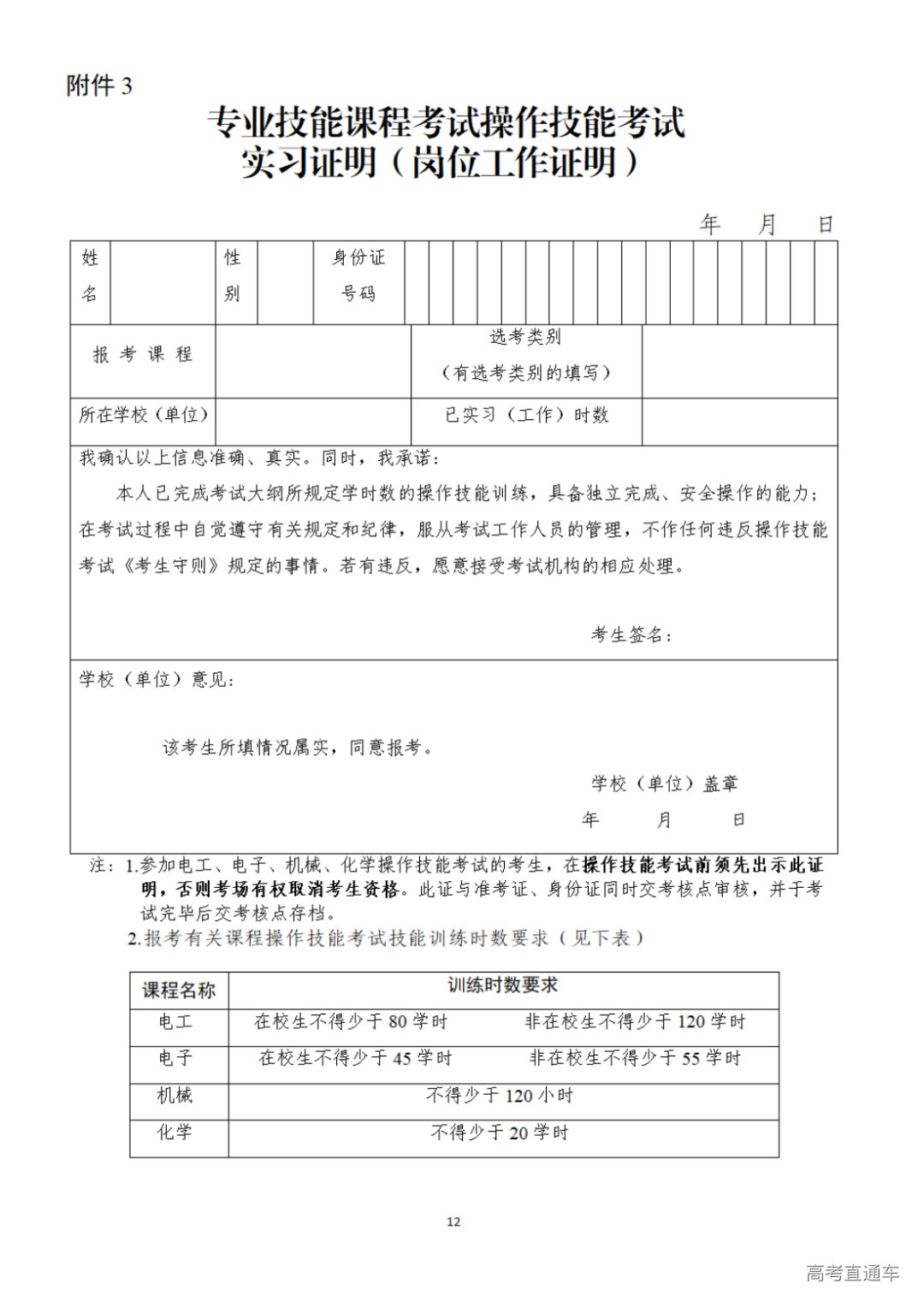 3.报考《电工》《电子》《机械》《化学》操作技能考试的考生,在参加该科目操作技能考试时须出示学校(单位)开具的《专业技能课程考试操作技能考试实习证明(岗位工作证明)》(格式见附件3),否则将不予参加该科目操作技能考试。