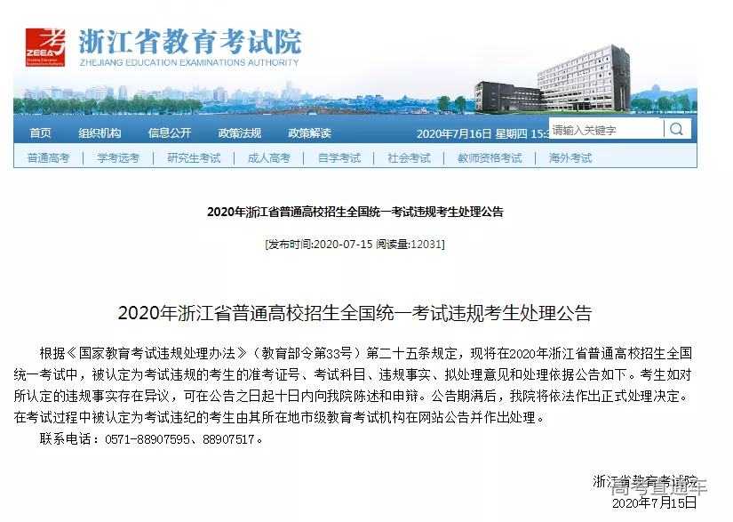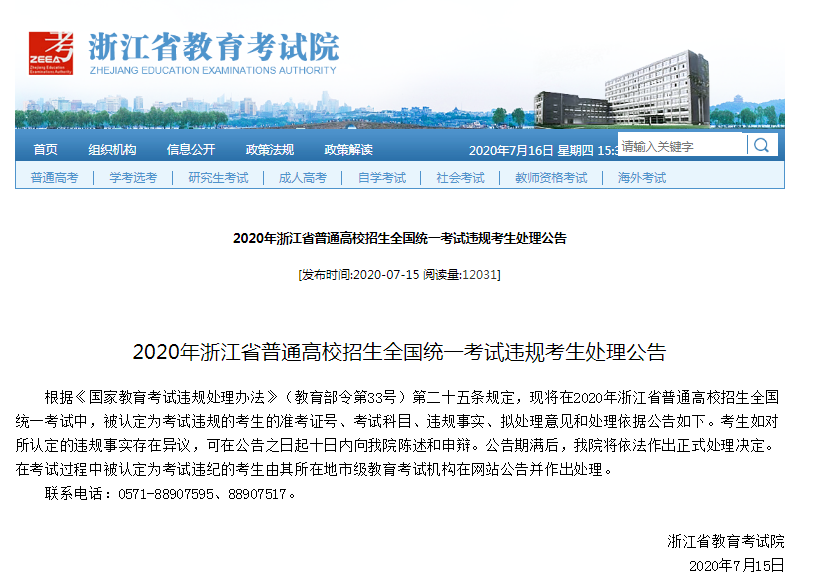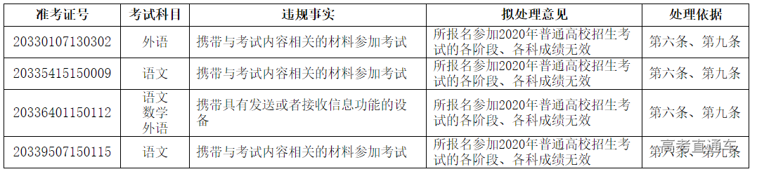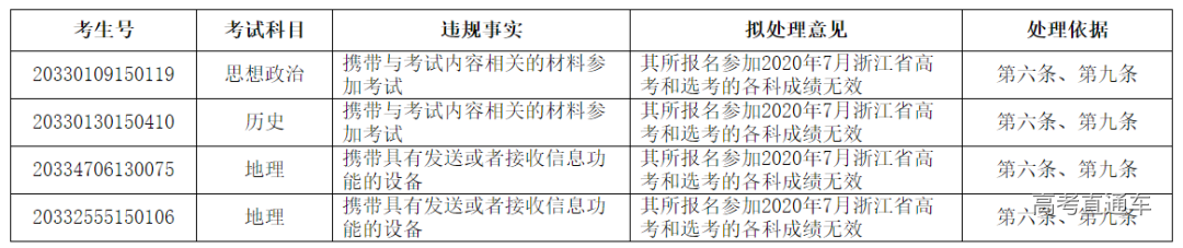 浙江省教育考试院发布了高考违规考生处理公告: