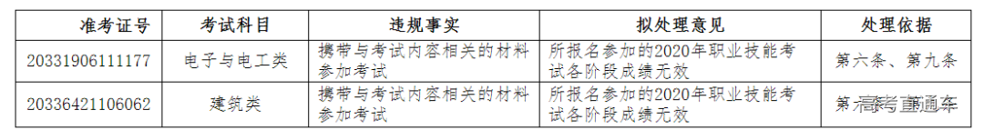 根据《国家教育考试违规处理办法》(教育部令第33号)第二十五条规定,现将在2020年浙江省高校招生职业技能理论考试中,被认定为考试违规的考生的准考证号、考试科目、违规事实、拟处理意见和处理依据公告如下。考生如对所认定的违规事实存在异议,可在公告之日起十日内向我院陈述和申辩。公告期满后,我院将依法作出正式处理决定。在考试过程中被认定为考试违纪的考生由其所在地市级教育考试机构在网站公告并作出处理。