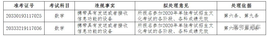 根据《国家教育考试违规处理办法》(教育部令第33号)第二十五条规定,现将在2020年浙江省单独考试招生文化考试中,被认定为考试违规的考生的准考证号、考试科目、违规事实、拟处理意见和处理依据公告如下。考生如对所认定的违规事实存在异议,可在公告之日起十日内向我院陈述和申辩。公告期满后,我院将依法作出正式处理决定。在考试过程中被认定为考试违纪的考生由其所在地市级教育考试机构在网站公告并作出处理。