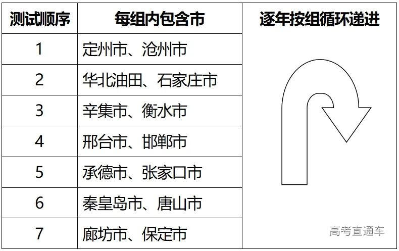 4.测试顺序:采取循环递进方式安排各市考生测试顺序。具体办法为:每2市为一组,按往年测试顺序将14个市分为7个组,逐年按组循环递进。2025年测试顺序依次为: