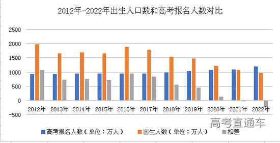 统计发现,从2012年到2022年,其中2012年高考人数和出生人数差最大,二者缺口达到1058万(出生1973万,高考报名915万)。此后两项数据的差距逐步变小,但多维持在800万左右。