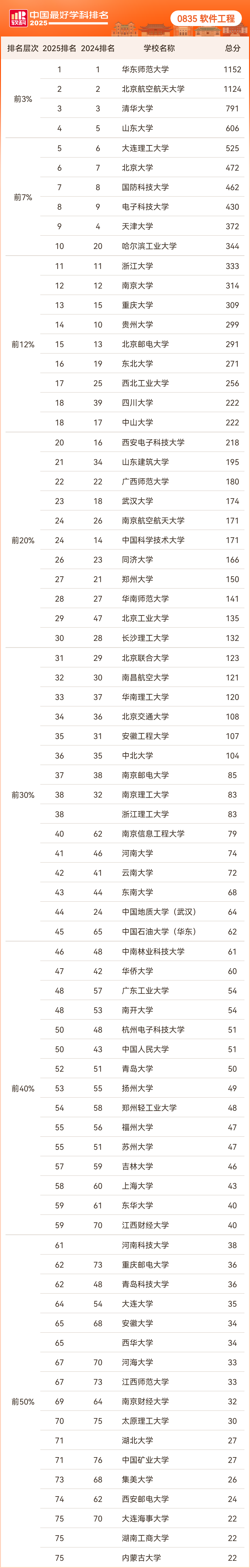 软件工程完整排名结果如下: