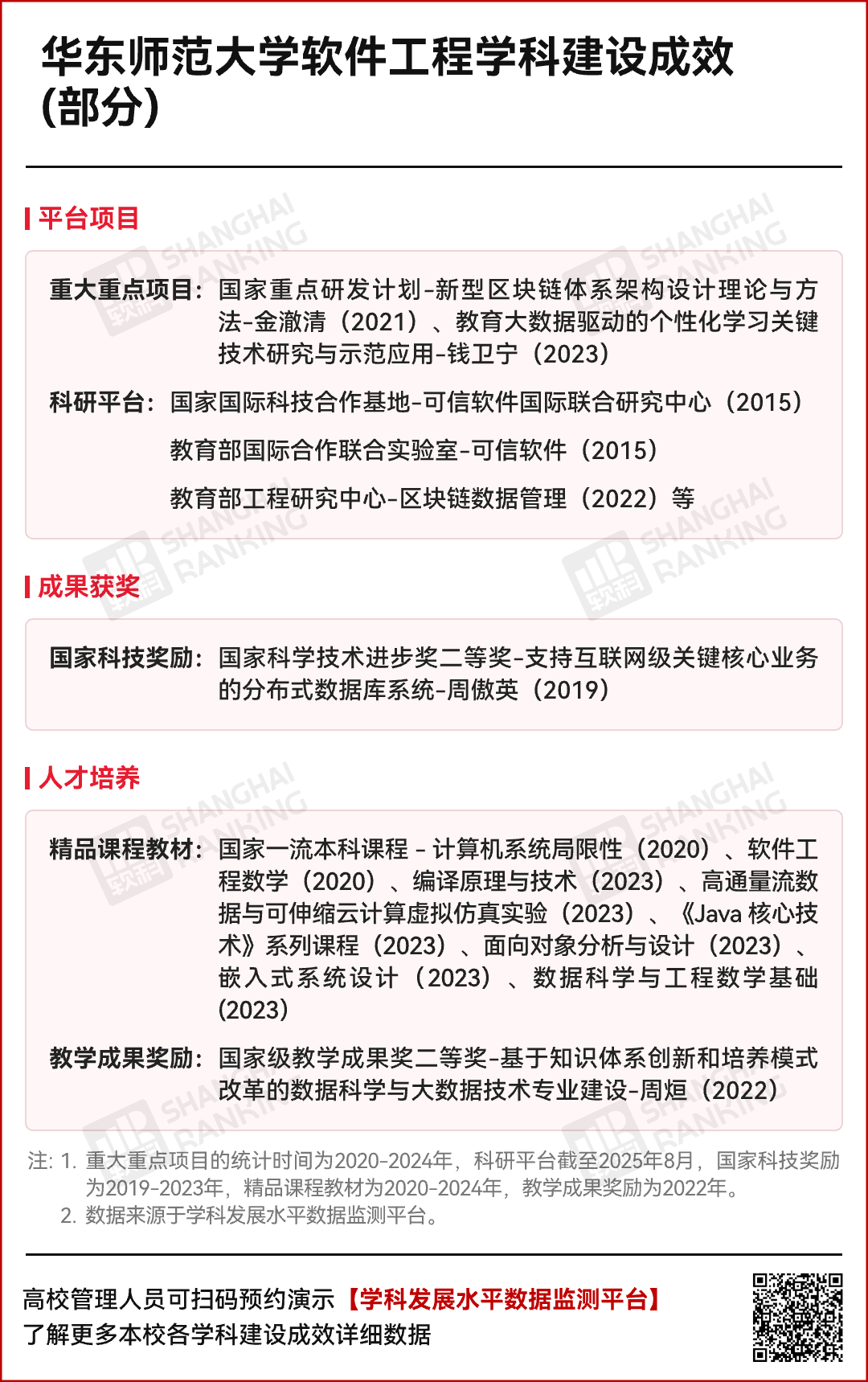 华东师范大学于2002年设立软件工程本科专业,2010年获批硕士点,2011年设立博士点,同年获批国家“十一五”重点建设学科。在软科中国最好学科排名中,已连续3年排名第1。建设至今,学校的软件工程学科取得诸多成效。