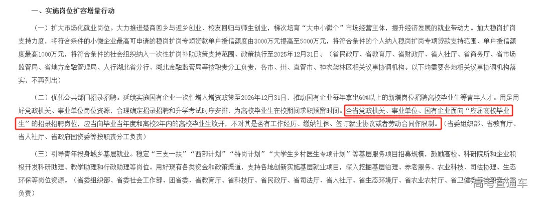日前,湖北省发布的《“才聚荆楚·共建支点”促进高校毕业生等青年人才就业创业若干措施》提出,湖北省党政机关、事业单位、国有企业面向“应届高校毕业生”的招录招聘岗位,应当向毕业当年度和离校2年内的高校毕业生放开,不对其是否有工作经历、缴纳社保、签订就业协议或者劳动合同作限制。