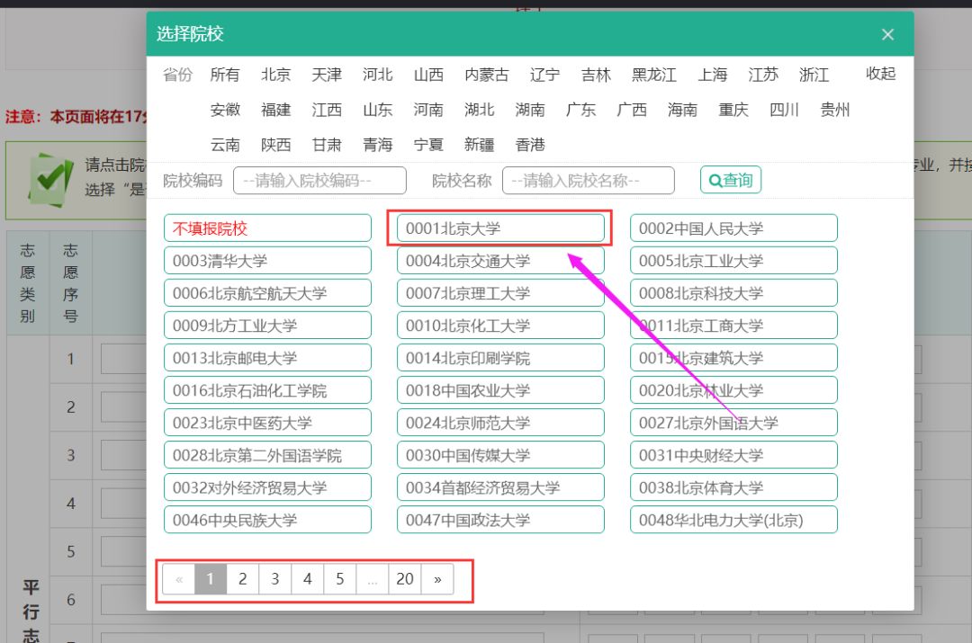 点击院校输入框,在弹出院校选择界面点击“所有”或省份名称,将列出院校名称,点击院校名称,将自动填入该院校志愿。