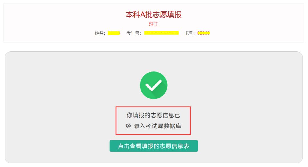 依次填写完需要填报的志愿后,点“确认提交”按钮,考生填报的志愿将被保存到省考试局数据库。