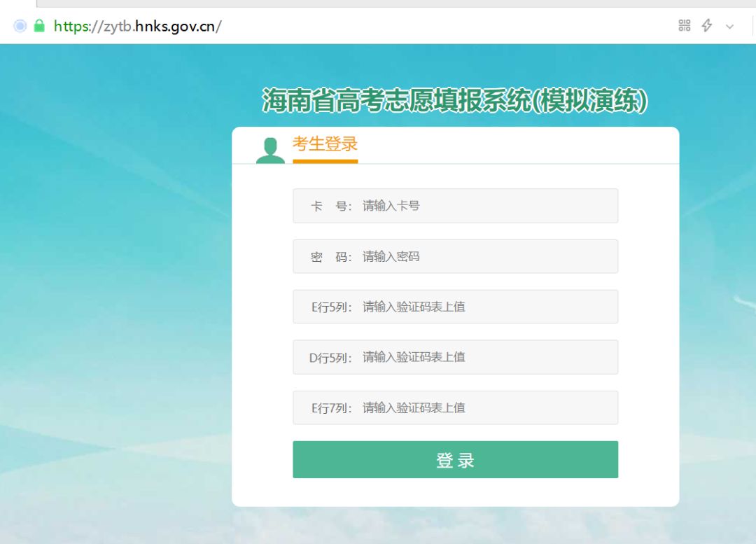 1.打开浏览器后,考生在地址栏输入网址http://ea.hainan.gov.cn进入海南省考试局网站,点击海南省2019年普通高校招生志愿模拟演练链接进入志愿填报系统登录界面。