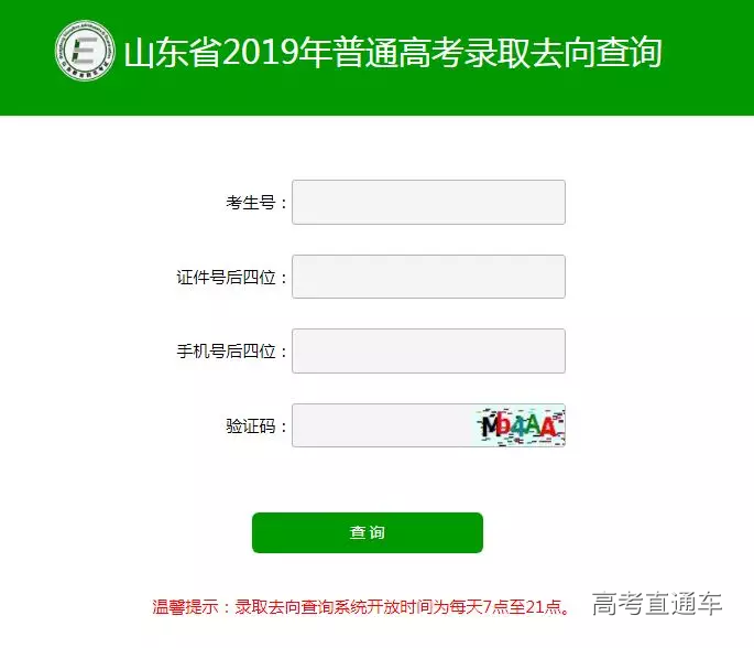 考生可登陆山东省考试院官方网站(http://www.sdzk.cn/),从“要闻速递”中点击山东省2019年普通高考录取去向查询,进入查询界面,如下图,考生根据要求,输入考生号、证件号后四位等相关信息,即可查询。