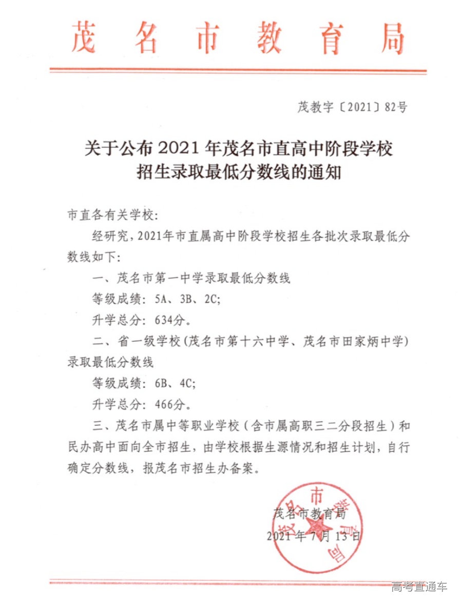 关于公布2021年茂名市直高中阶段学校招生录取最低分数线的通知