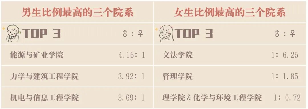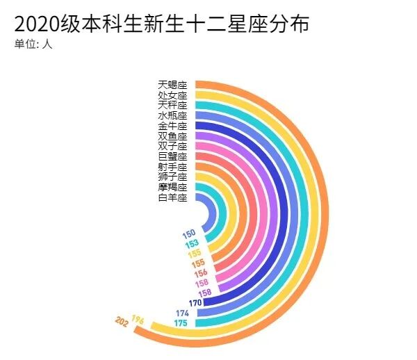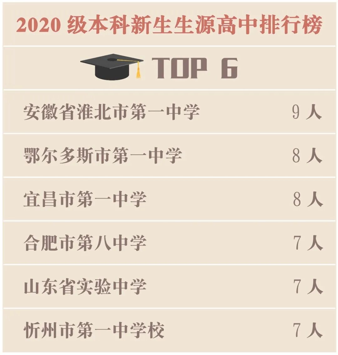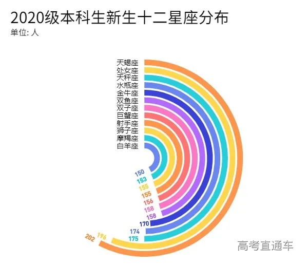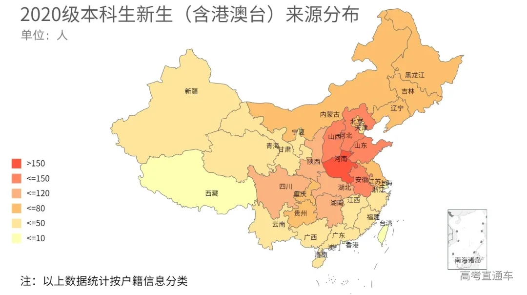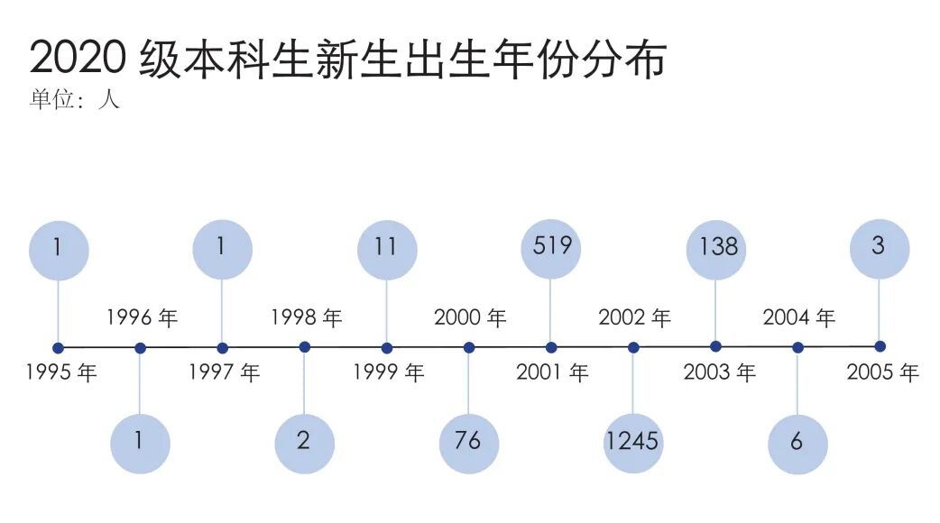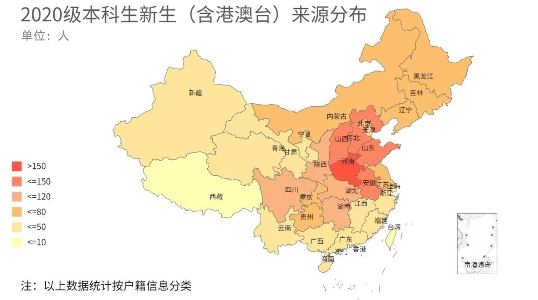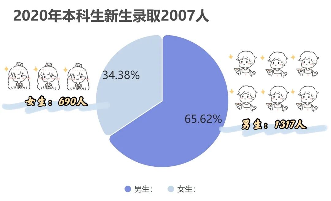 历经了不平凡的高考,2020级新生终于到来!他们即将踏入矿大(北京),开启崭新的“CUMTBer”生活。话不多说,快跟随小招一起揭开萌新们的“神秘面纱”吧~ 新生人数及男女比例 2020年,矿大(北京)迎来了2007位小萌新,其中包括女生690名、男生1317名。男女比例约为2 : 1,与往年持平。 在九大学院中,能源与矿业学院以4.16:1的男女比荣获“男生比例最高院系”称号,文法学院以0.16 :1的男女比荣获“女生比例最高院系”称号,新学期的“破冰活动”强烈建议两院联谊! 学院人数排行榜 从录取人数来看,今年机电与信息工程学院人数最多,共加入了394位萌新,阵容庞大。 各学院虽然人数上有差距,但这并不重要,我们都是一家人! 考生类型 2020级新生中,包括普通考生1826人、国家专项考生111人、高校专项考生40人、内地新疆班考生24人,港澳台考生6人。 2020级新生从五湖四海而来,迈向了“明德至善,好学力行”的大学旅程。从录取省份来看,河南省占主导地位,为矿大(北京)输送了153位优秀的新生。 高考成绩之最 2020级新生继续保持了良好的生源质量,高考成绩人数最多的分数为602分,有61人(本统计含高校专项及国家专项等所有招生类型)。 在非高考综合改革省份中,普通理工类考生平均分高于当地一本线(特殊类型招生控制线)平均为83.79分,分数最高者646分,高于当地一本线(特殊类型招生控制线)126分;普通文史类考生平均分高于当地一本线(特殊类型招生控制线)平均为51.29分,分数最高者615分,高于当地一本线(特殊类型招生控制线)77分。在高考综合改革的5个省份中,普通类考生平均分高于当地一本线(特殊类型招生控制线)平均为66.5分。 高中情况 2020年,1336所高中为我校提供了优质生源。其中,安徽省淮北市第一中学荣登生源贡献最多榜首,快来看看你的母校上榜了吗。 姓甚名谁 姓名,是我们认识一个人的第一步。这2007名同学中涵盖了270种姓氏,其中,李、张、王的队伍最为庞大,都达150人以上。 硕,是出现最高频的名字,你能在这里找到10个“相同的”自己;83个同学名字中包含“宇”、61个同学名字中包含“文”、59个同学名字中包含“佳”。 重名的小可爱也有不少,不信你站在校园内大喊一声“张瀚文”,说不定会收到3声回应呢。 新生年龄 2020级新生中,“千禧一代”以99.25%的占比获得了人数上的绝对优势。年龄最小的出生于2005年10月24日,ta还未满15周岁。在矿大(北京),年龄从不是问题,学习是终身的事业,求知求学、不负韶华是我们的共同目标。 星座分布 2020录取季,矿大(北京)集齐了十二星座盲盒。抽到的星座人数榜首的是神秘坚韧的天蝎座,为202人;热情坦率的白羊座人数最少,为150人。一起期待十二星座在矿大(北京)擦出不一样的火花吧~ 新生生日 据统计,有6位新生出生于2001年11月10日,与我矿同庆生。2002年02月19日是个特别的日子,有10位准CUMTBer出生于这一天,是缘分让你们相遇在矿大(北京)。有2位新生在9月15日生日,新生报到和生日更配噢~ 在9月3日,在全体2020级本科生新生中,有1位同学今天过生日,欢迎这位同学在评论区留言~小招祝你生日快乐! 恰同学少年,风华正茂。九月,矿大(北京)已一切准备就绪,等待着迎接新伙伴们到来。祝愿2020级CUMTBer们,顺利开启新征途,在未来的道路上,永远满心热血,披荆斩棘!