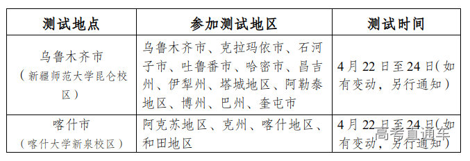 三、测试时间:4月22日至24日(如因天气原因临时有变动,另行通知,请随时关注新疆教育考试院官方网站有关信息)。