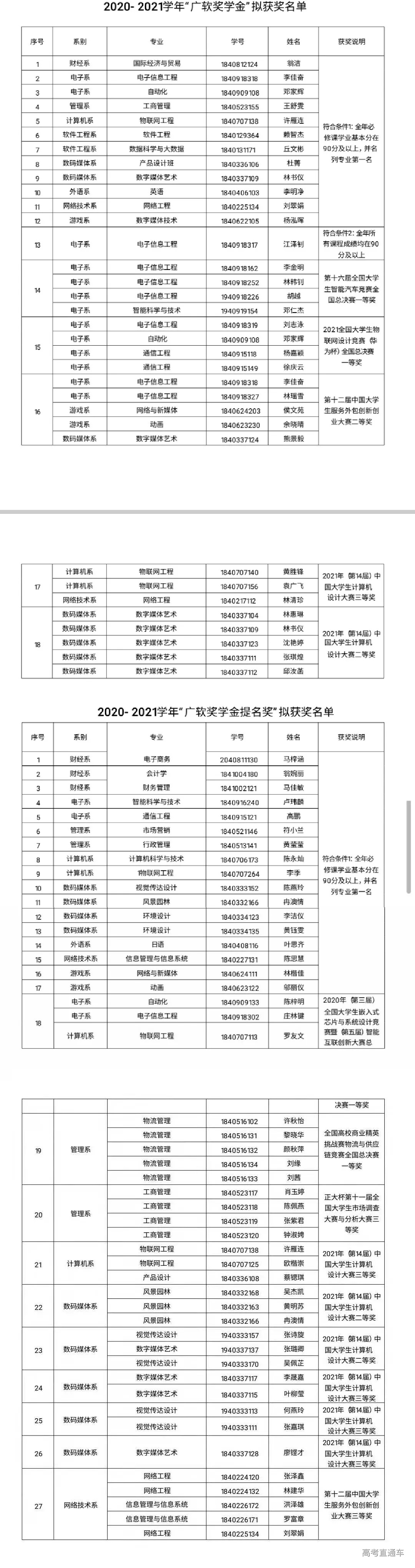 根据《广州软件学院学生评优、评先和奖学金评定实施办法》,由学生本人申请,经系初审,学生处审核并组织公开答辩,从学生的思想政治、品德修养、学习成绩、专业竞赛、学生工作经历、社会实践和志愿服务、对院系的影响力和贡献等方面综合评审,报学校研究决定,拟授予财经系翁洁等18名同学(或团队)“广软奖学金”,电子系卢玮麟等27名同学(或团队)“广软奖学金提名奖”。具体名单分别见附件。