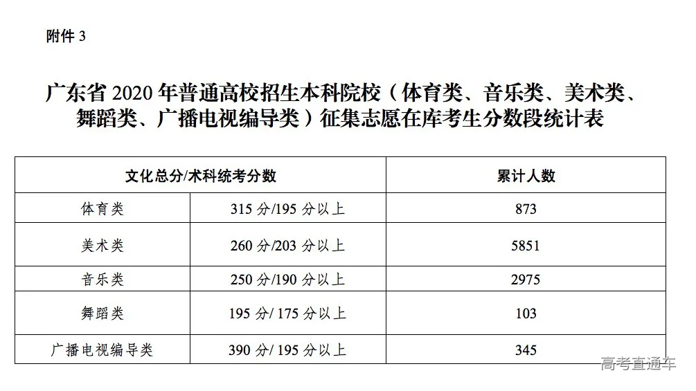 广东省2020年普通高校招生本科院校(体育类、音乐类、美术类、舞蹈类、广播电视编导类)征集志愿在库分数段统计表