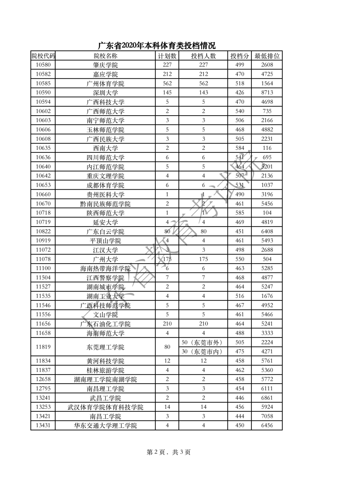 广东省2020年体育类、艺术类(音乐/舞蹈/美术/广播电视编导)本科统考投档最低分排位