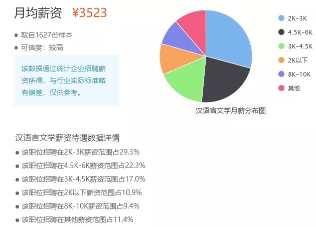 汉语言文学是包含语言和文学两个领域, 主要是研究文学流派、小说等作品还会涉及哲学、政治等方面的知识从而培养具有汉语言文学基本理论、基础知识和基本技能的一门学科。 该专业主要课程:语言学概论、现代汉语、古代汉语、中国古代文学史、中国现代文学史、现代汉语、写作、文学概论、外国文学史等。 阳光高考数据显示每年本科毕业生规模在9万人左右,就业率高达95%,全国开设此专业院校有607所,95%以上院校都是招收文科生。可以看出此专业在学习的知识面很广,那么在就业方向是也是如此吗,具体能做什么呢? 该专业的主要就业方向:在党政机关、企事业单位、出版单位、广告公司、科研机构从事文秘 、文案类、记者、编辑、策划等工作。 从就业方向来看,该专业的就业范围很广,大部分的岗位都是每家公司所需要的人才,文学类专业小伙伴一般理解能力不俗,所以小编建议该专业的理论知识要掌握牢固,多多积累知识,确定未来的职业方向是在哪个领域,这样有利于今后出来就业的确定性,更好的投入工作并且成长,少走职场的弯路。 来源:猎聘 数据显示该专业平均工资在约3523元,相关专业岗位月平均4.5k-6k占比在22.3%,8k-10k占比在9.4%,截取这两个数据我们可以看到,该专业的升职空间还是很大的,当然了,没有一步登天的高楼,首先是地基先打牢。 其次是保持一颗学习的心,最后随着经验的增长,能力也会紧跟着提升。那么热爱文学的你在志愿填报的时候需要注意什么呢? 首先对文学没有一定的领悟能力以及兴趣,考生要谨慎报考,因为文学知识并非比理工类专业简单。 其次分清汉语言和汉语言文学这两个专业。前者更注重逻辑思维能力,后者偏性感性思维,考生可根据自身能力填报。 最后填报志愿一定要查看学校的招生简章所有注意事项的要求(是否有单科成绩要求,以及色盲色弱等方面要求),避免退档情况。
