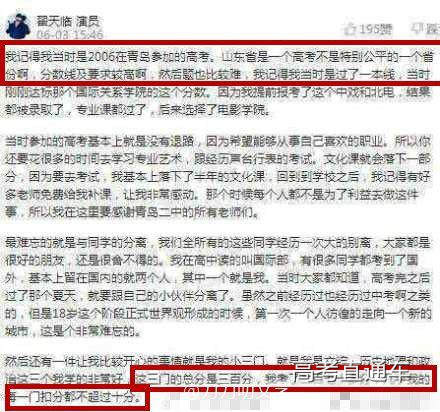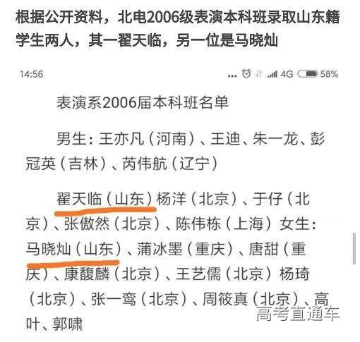 而对比2006年北京电影学院在山东录取学生的数据,2006年表演系在山东招了两个学生:翟天临和马晓灿,说明翟天临的高考分数就是348和402其中一个,也就是说,所谓的“高考分数580分”是假的。